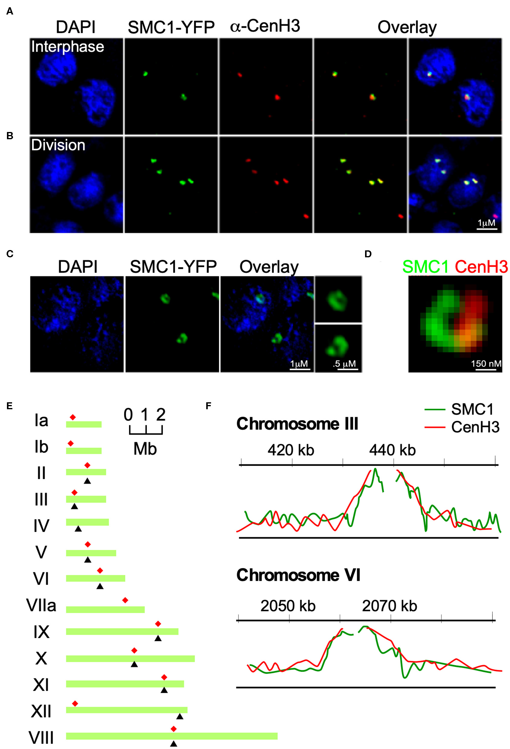 TgSMC1 is a persistent centromeric protein. (A,B) Immunofluorescence assay. TgSMC1-YFP (green) was co-stained with anti-TgCenH3 antibodies (green). The signals for TgSMC1 and the marker for the T. gondii centromeres show tight co-localization both in interphase (A) and dividing (B) parasites. TgSMC1 persists at the centromere both during all stages of mitosis and interphase. (C) Super Resolution (SR-SIM) image of TgSMC1-YFP stained with anti-GFP. TgSMC1 localization appears to be in the shape of a hollow oval (D) Zoom of the SR-SIM image of TgSMC1-YFP, co-stained with anti-GFP and anti-TgCenH3. TgSMC1 (green) appears to surround the centromeres marked by TgCenH3 (red). (E) Schematic representation of T. gondii's chromosomes. Red asterisks indicate the position of the centromeres, mapped previously, for each chromosome. Black arrowheads correspond to the hybridization peaks obtained from the TgSMC1-HA cell line ChIP-CHIP experiments for each chromosome. (F) Hybridization peaks on a microarray CHIP covering the genome of T. gondii, of immunoprecipitated chromatin from the TgSMC1-HA cell line (green line). Chromosomes III and VI are shown as representative examples. Our previous ChIP-CHIP results using the TgCenH3-HA cell line (red line) are shown, overlaid, as reference.
