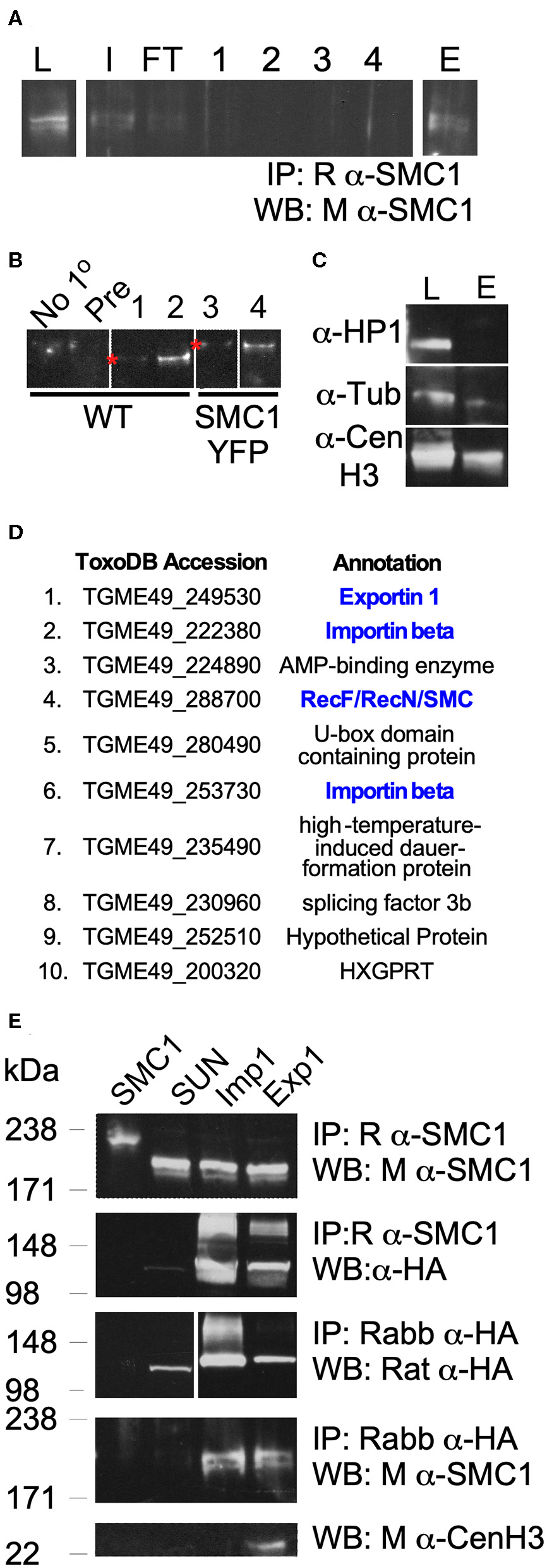 TgSMC1 Co-precipitates with Peripheral Components of the Nuclear Pore Complex. (A) Representative western blot of an immuno-precipitation experiment from parasite lysate using an anti-TgSMC1 antibody (L, lysate; I, input; FT, flow through; 1–4, washes; E, elution). (B) Western Blot. Elutions fractions E of immunoprecipitations using no primary antibody (No-1°), pre-immune sera (Pre) or the following antibodies: 1- Rabbit anti-SMC1, 2- Affinity Purified Rabbit anti-SMC1, 3, and 4- anti-GFP, and probed with mouse anti-SMC1. The strains used to generate parasite lysates (input) are specified below. (C) Western blot. Parasite lysate or the elution fraction of an immuno-precipitation using rabbit anti-SMC1 were probed with the indicated antibodies. Mouse anti-HP1 recognizes TgChromo1, a chromodomain protein which binds peri-centromeric DNA, and was used as a control for the specificity of our pull downs (L, total lysate; E, elution fraction). (D) The 10 most abundant co-precipitants of TgSMC1 are listed. Complete results of the Mass spectrometry analysis of all elution fractions of multiple immuno-precipitation experiments can be found in Table S1. Proteins highlighted in blue were followed up. (E) TgExp1 and TgImp1 (TgME49_249530 and TgME49_253730 respectively), which co-immunoprecipitated with TgSMC1, were endogenously tagged with a C-terminal 3xHA. TgSUN1 (TgME49_288530) is annotated as a hypothetical protein containing a Sun domain. This protein was represented by 2 peptides in the Mass spectrometry analysis of SMC1-YFP anti-GFP Co-IP, but was not found in other samples, and was used as a negative control (Table S1). TgSMC1 was pulled down using Rabbit anti-SMC1 antibodies in TgSMC1-YFP, TgImp1-HA, TgExp1-HA, and TgSUN-HA cells lines, and probed with mouse anti-SMC1 or anti-HA. Conversely, TgImp1, TgExp1, and TgSUN were pulled down using anti-HA antibodies, and the elution fractions were probed with anti-TgSMC1. These results recapitulate our LC-MS results. In addition to co-precipitating with TgSMC1, TgExp1 also co-precipitates with TgCENH3.