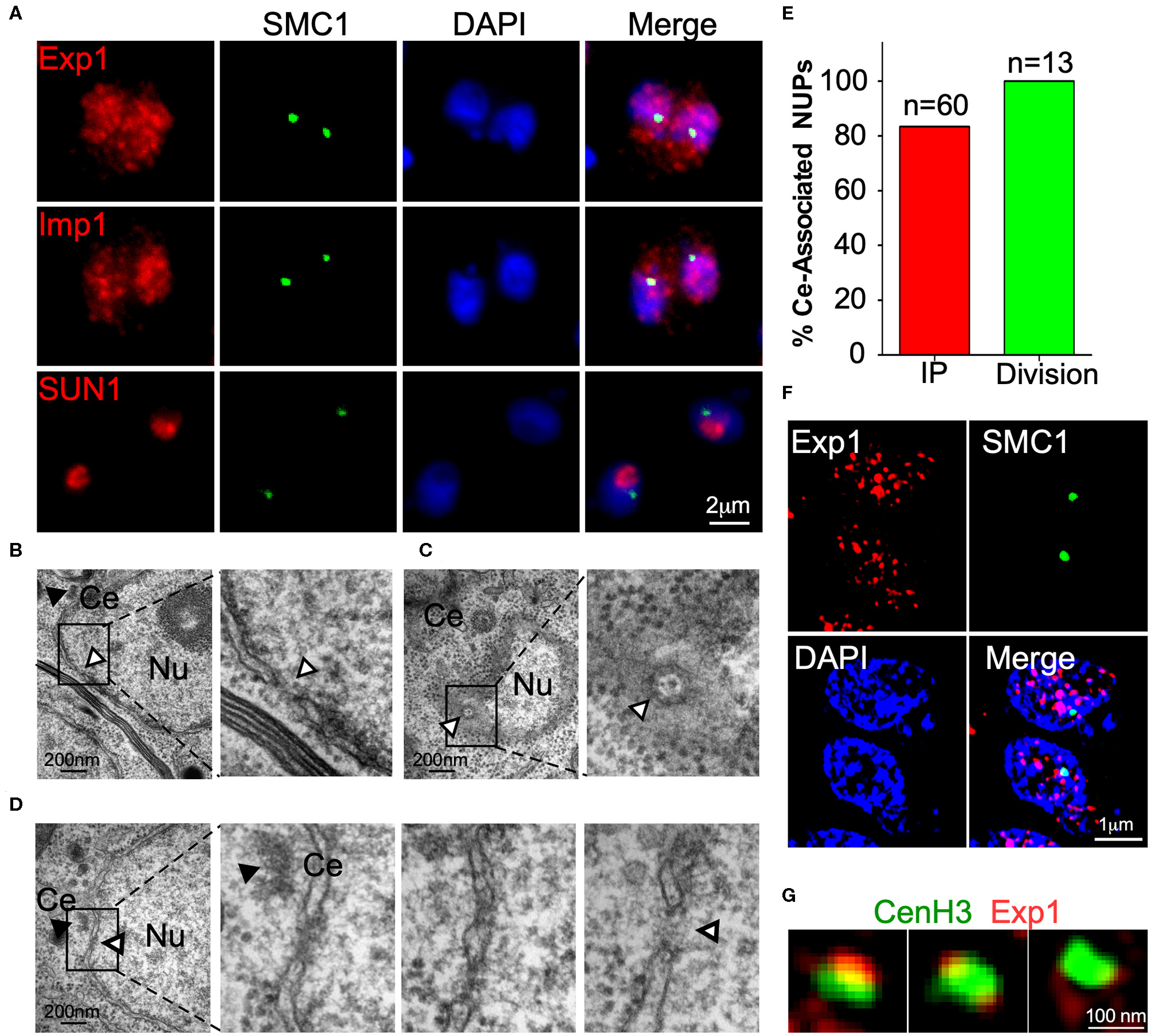 The TgSMC1 interactors identified, TgExp1 and TgImp1, localize to discrete foci in the nucleus, and co-localize or flank the location of centromeres in the nuclear periphery. By TEM we established that an opening in the nuclear envelope can be observed adjacent to the centrosome in interphase nuclei, implying that centromeres arrange in the vicinity of an NPC.
