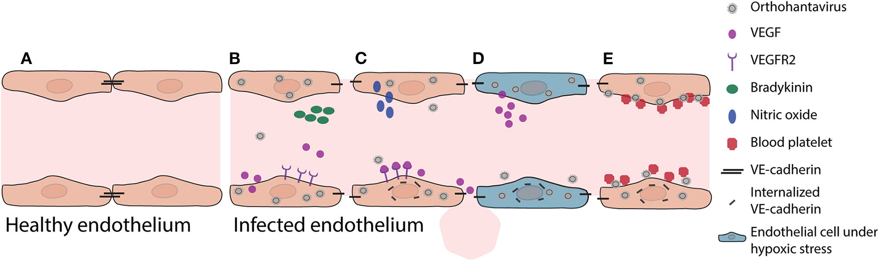 Pathogenic mechanisms in vascular endothelium during initial orthohantavirus infection. (A) Healthy vascular ECs contain a tightly regulated barrier, mainly based on adherens junction molecules such as VE-cadherin. (B) Important soluble factors that maintain this barrier function are bradykinin and VEGF. As response to infection, ECs produce and secrete VEGF. (C) Local VEGF binds to endothelial receptors and disengages adherens junctions by increased nitric oxide production and internalization of VE-cadherin. (D) Under hypoxic conditions (for instance due to pulmonary edema), these effects are even expanded as VEGF production is increased, causing increased vascular permeability. (E) In addition, orthohantavirus particles present on the endothelial cell surface recruit quiescent platelets to endothelial cell surfaces. This increased consumption of blood platelets may contribute in part to thrombocytopenia. Both the permeabilizing effects of secreted VEGF and the recruitment of platelets lead to internalization of VE-cadherin (i.e., loss of endothelial barrier function).