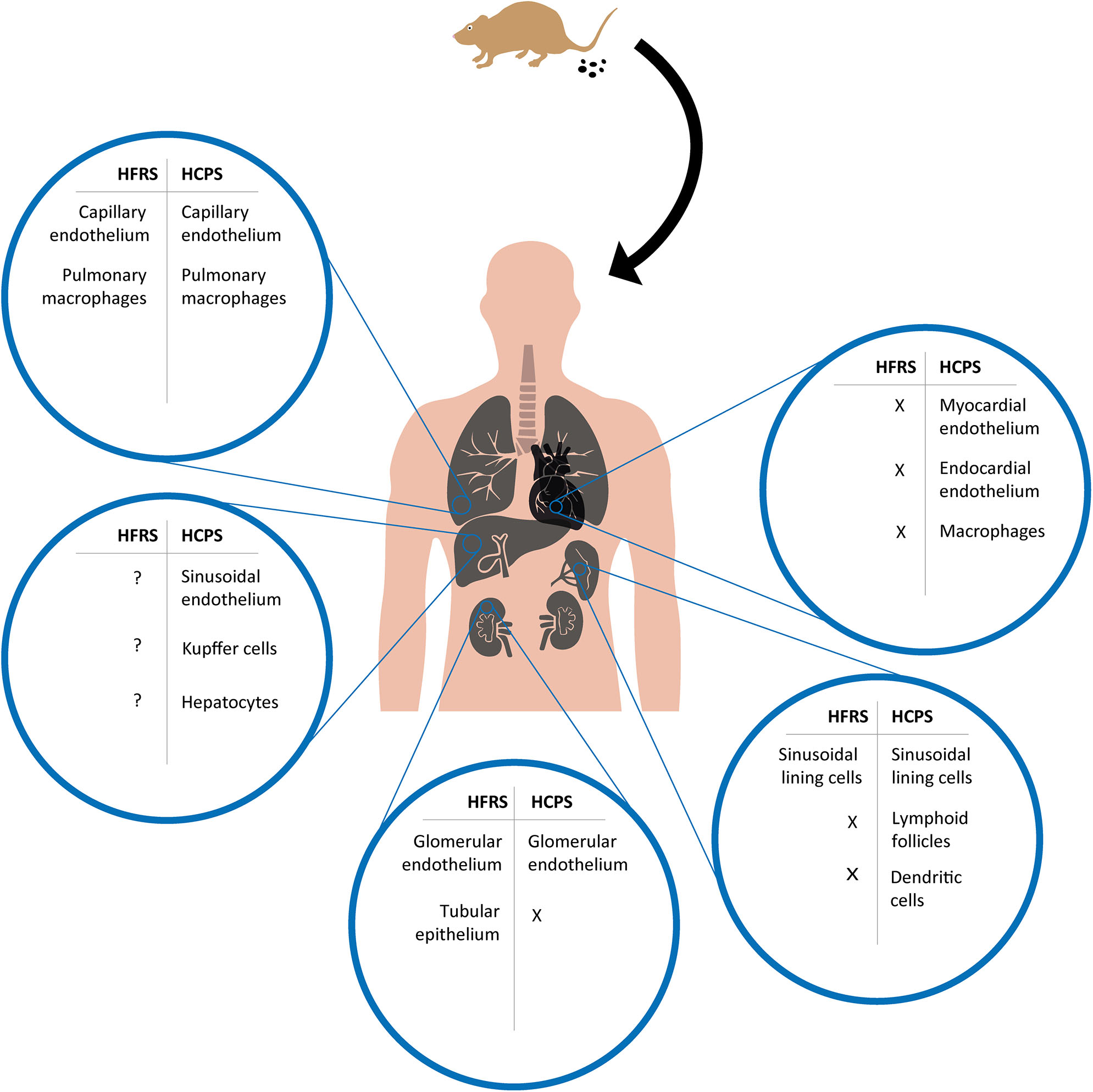 Overview of cell tropism during HFRS and HCPS based on human and experimental disease models. After a human host is infected by inhalation of virus containing aerosolized excreta of an infected rodent, orthohantavirus is able to reach multiple organs and infect different cell types. Potentially infected cell types during HFRS and HCPS are compared for major organs in which viral antigens have been detected in human tissues or experimental disease models; lungs, heart, kidneys, liver, and spleen. X = absence of viral antigen; ? = viral antigen presence not specified.