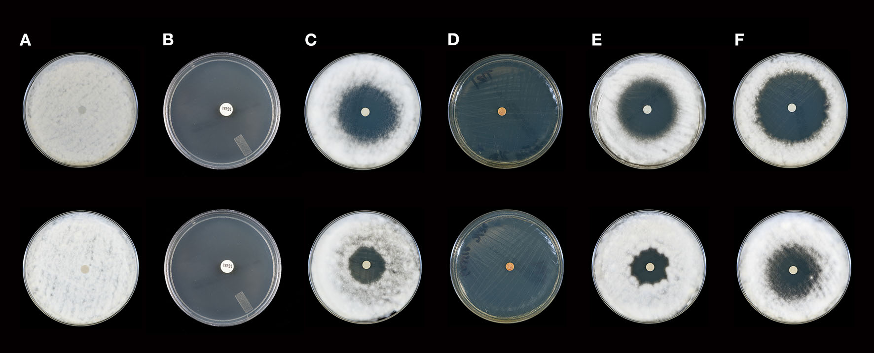 Once each essential oil had been mixed well with the 55°C agar suspension it was poured into individual petri dishes and allowed to solidify at room temperature in a biological safety cabinet. Subsequently, spore suspensions from each individual strain were made using 2 ml of sterile water, vortexed for 1 min, and 10-fold dilutions prepared ranging from 10−1 to 10−5 CFU/ml. Individual dilutions (100 μl) were inoculated onto control and essential oil-containing plates, distributed evenly over the agar surface using sterile glass beads, and followed by incubation at 30°C for 21 days. Viable counts on control plates vs. essential oil-containing plates were determined and the lowest dilution of oil resulting in ≥99% inhibition of fungal growth was defined as the MIC.