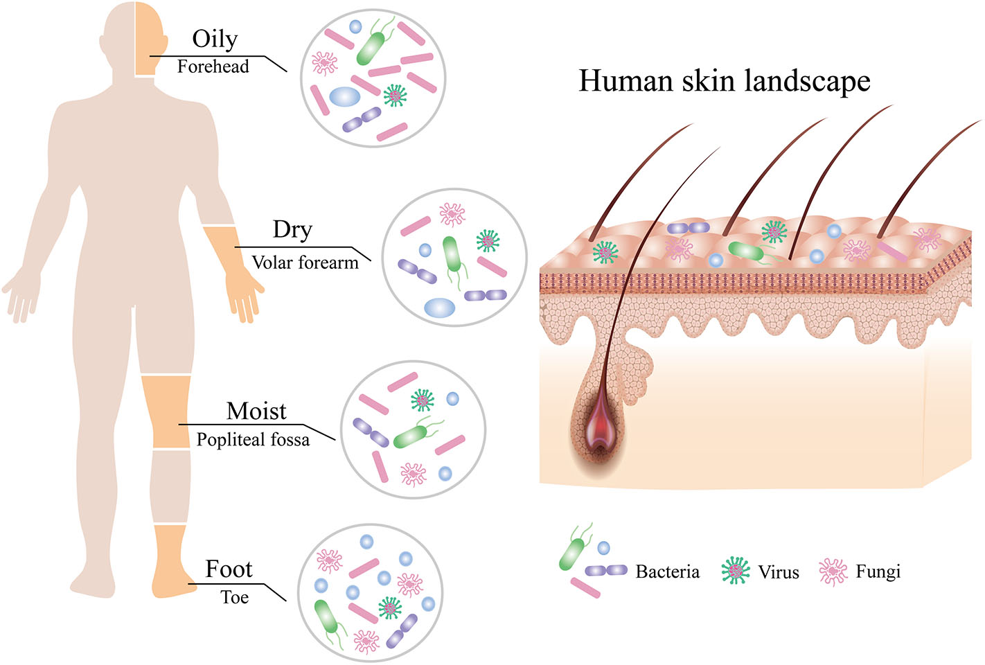 Figure 1. Composition of the human skin microbiota. The human skin is inhabited by millions of bacteria, fungi, and viruses that compose the skin microbiota. The composition of human skin microbiota is shaped by biogeography of the skin site including oily, moist, dry, and foot sites. Bacteria are the most abundant at all sites, followed by fungi, with the fewest viruses.