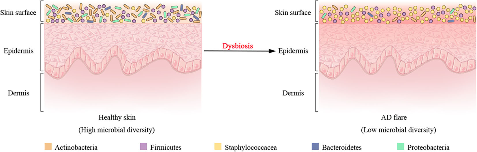 Figure 2. Shift of bacterial communities during atopic dermatitis (AD) disease progression. Four most prominent bacterial taxa (Actinobacteria, Firmicutes, Bacteroidetes, and Proteobacteria) and the Staphylococcaceae (a Firmicute) are found on the surface of healthy skin. Dysbiosis in AD flares is characterized by a decline in bacterial diversity and the dramatic augment in relative abundance of Staphylococcaceae.