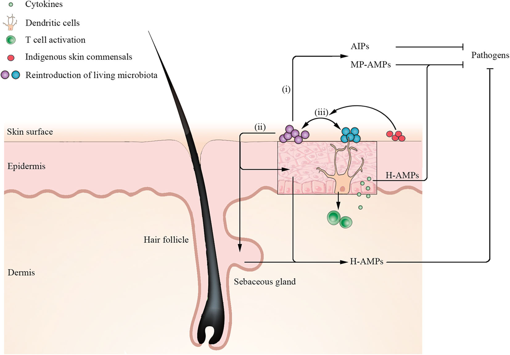 Figure 4. Mechanisms for establishment and restoration of cutaneous homeostasis by reintroduction of living microbiota. Application of a single of microbiota such as S. hominis secretes microbiota-produced antimicrobial peptides (MP-AMPs) or other metabolites [such as autoinducing peptides (AIPs)] to inhibit pathogen S. aureus. Moreover, reintroduction of living microbiota induces keratinocytes and sebocytes to secrete human AMPs (H-AMPs) to directly inhibit pathogens. Notably, dendritic cells (DCs) extend their dendrites into the stratum corneum to acquire microbial antigens and active T cells to release cytokines. Keratinocytes-produced H-AMPs LL-37 induced by cytokines synergize with MP-MAPs (such as S. epidermidis lantibiotics), which can kill S. aureus more effectively. In addition, reintroduction of a cocktail of microbiota has a synergistic effect on ameliorating the ecology of skin microbial communities. When certain indigenous skin commensals are rich in recipient skin, reintroduction of a cocktail of microbiota has a higher engraftment.