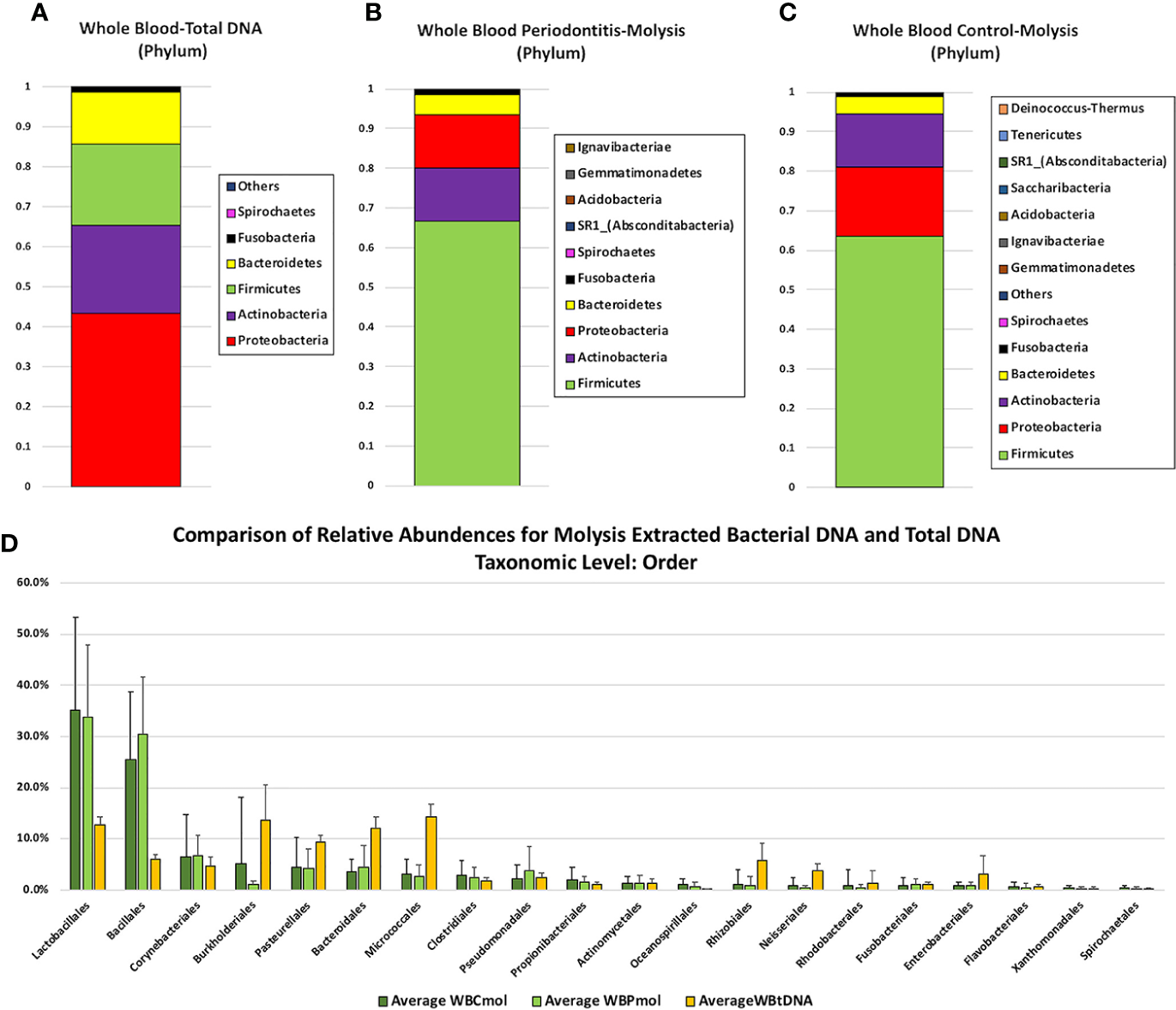 Comparison of phylum level relative abundance profiles from (A) total DNA samples extracted from whole blood by PCI (n = 4), (B) Molysis-extracted DNA from whole blood from control patients (WBC) (n = 19), and (C) Molysis-extracted DNA from blood from patients with periodontitis (WBP) (n = 17).The OTU representing 3 members of the Streptococcus mitis group is designated SMG-subgroup. Panel 1(D) compares average percentage composition profiles for total DNA samples versus MolYsis-extracted samples at the Order level.