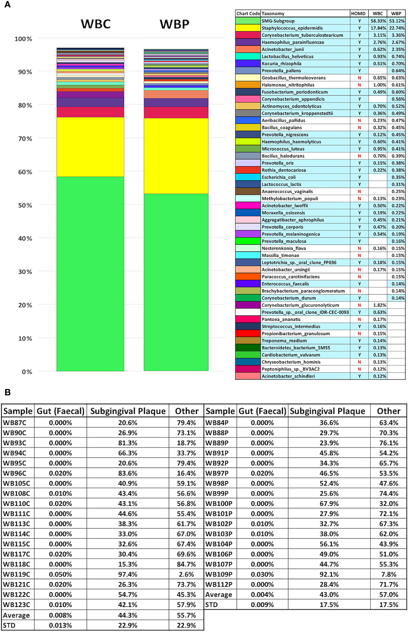 Percentage composition of the 40 most abundant bacterial species in whole blood from the periodontally healthy (WBC) and severe periodontitis (WBP) groups displayed with potentially orally-derived taxa [found in the Human Oral Microbiome Database(homd.org)] indicated by y/n and highlighted in blue (A) and Source Tracker2 analysis using faecal and subgingival training datasets (B).