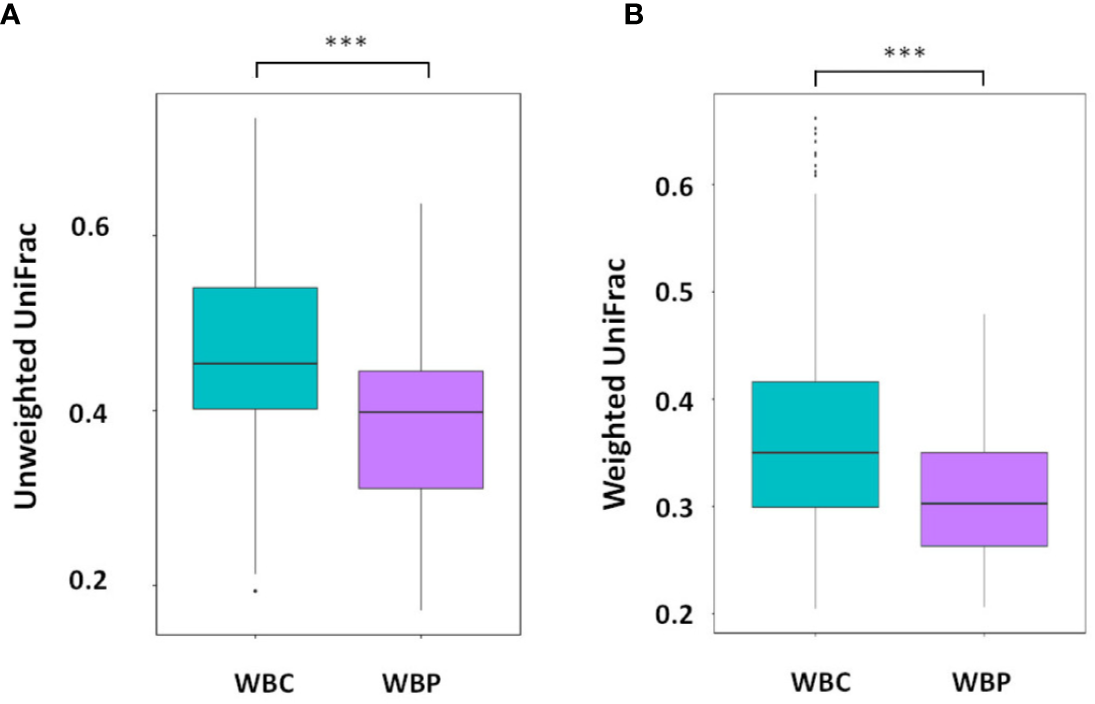 There were only two taxa that showed significantly different levels between WBC and WBP and both were minor components: (p) Saccharibacteria (q value 0.002), an oral taxon which was not present in WBP and (p) Proteobacteria; (c) Deltaproteobacteria; (o) Myxococcales (q value 0.03), higher in WBC.