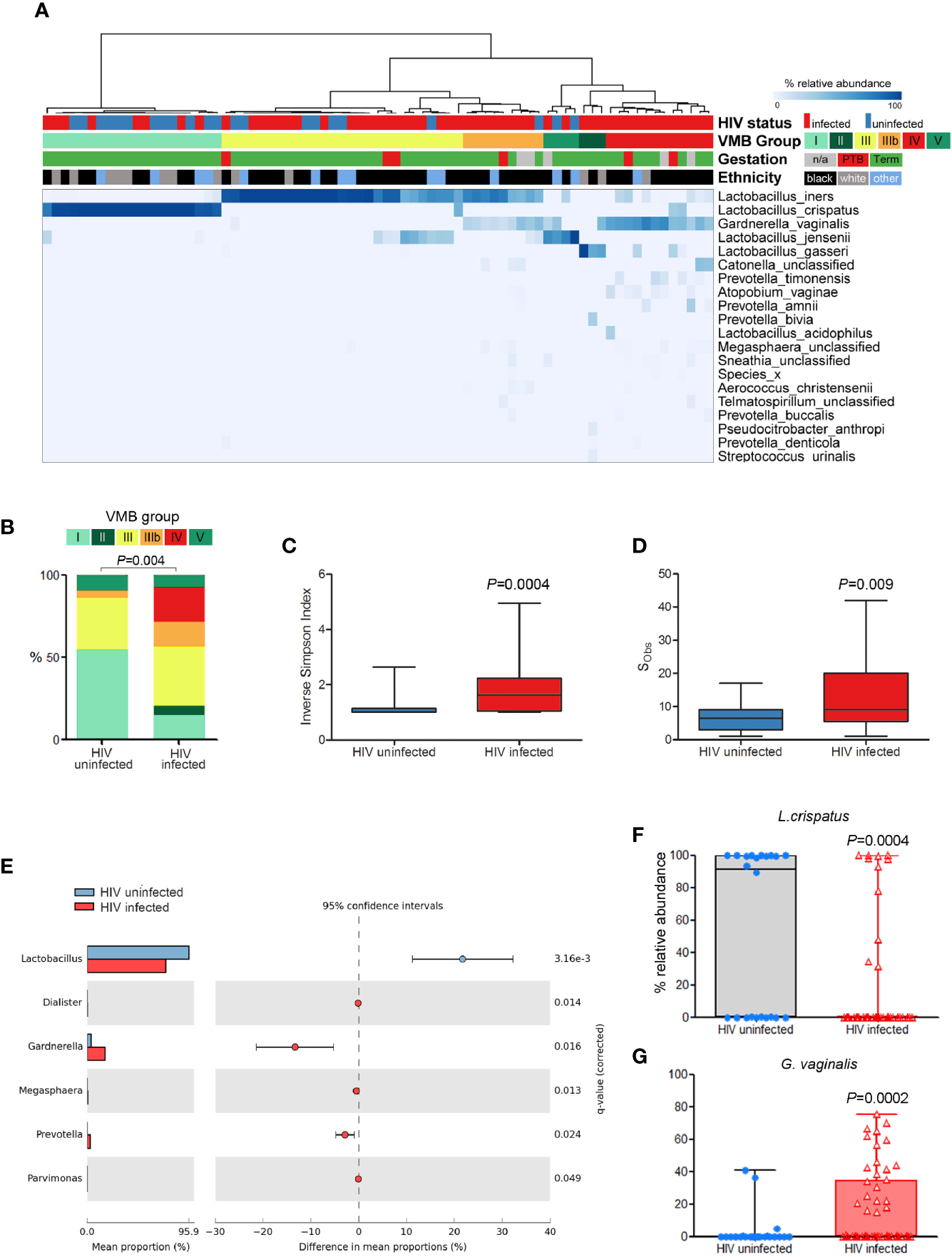 Comparison of vaginal microbiota composition of PWLWH (n = 53) and HUPW (n = 22) sampled during the second trimester of pregnancy. (A) Hierarchical clustering (Ward linkage) of relative abundance data of vaginal bacterial species identified six major vaginal microbiota (VMB) groups, with HIV status, ethnicity, and gestation at delivery for each patient presented above the heat map. (B) Proportions of VMB types differed significantly between PWLWH and HUPW with the former characterised by increased bacterial (C) diversity and (D) richness. (E) Compared to HUPW, samples from PWLWH had lower relative abundance of Lactobacillus spp. and Gardnerella spp. which were largely driven by significantly lower proportions of L crispatus(F) and higher proportions of G. vaginalis(G).