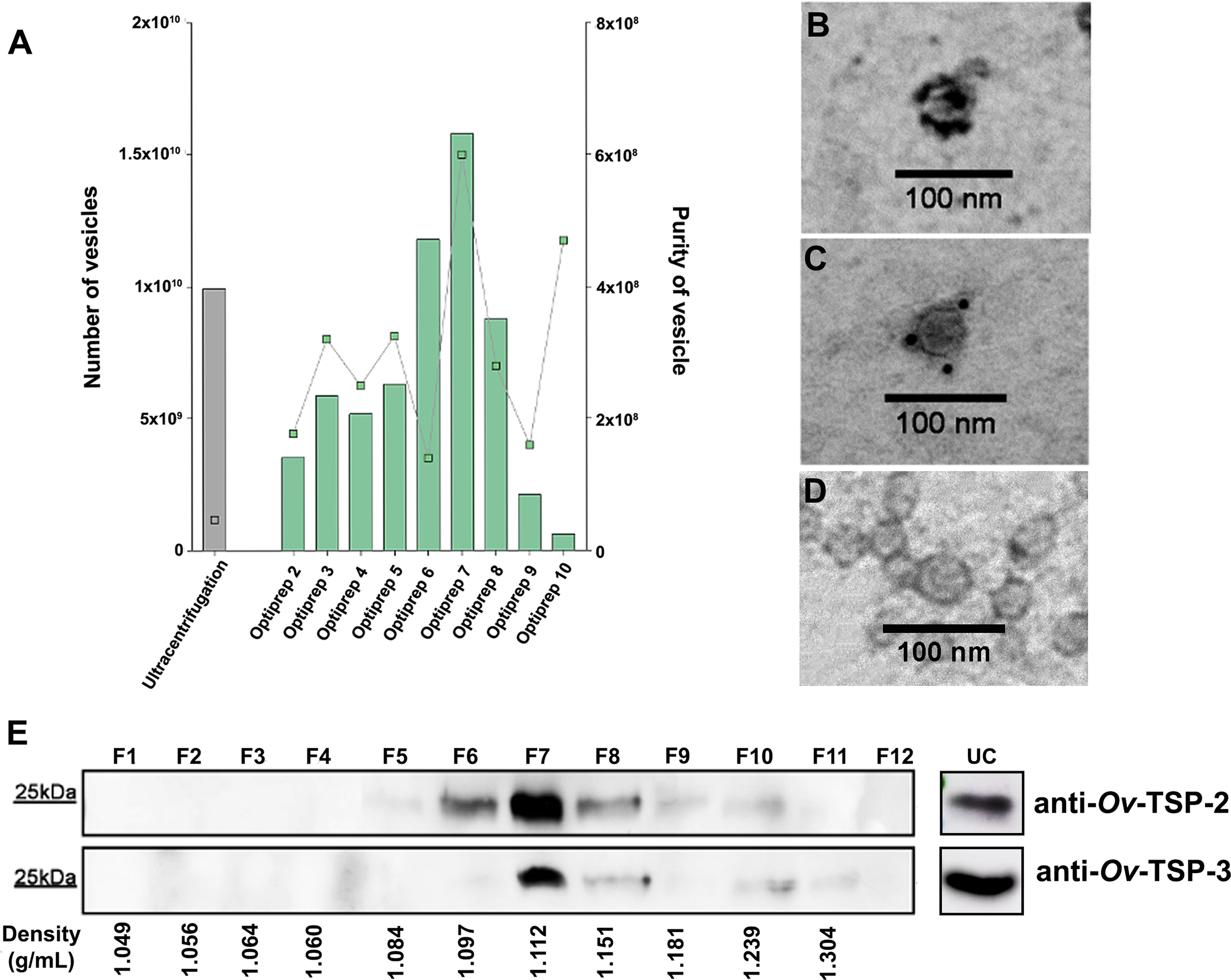 To validate the presence of tetraspanin proteins on the 120k EV surface, we performed immunogold TEM. Gold particles indicating antibody binding to Ov-TSP-2 (Figure 1B) and Ov-TSP-3 (Figure 1C) was observed on the surface of 120k EVs probed with anti-TSP but not negative control sera (Figure 1D). Moreover, equal volumes of fractions F1-F12 following iodixanol separation were loaded on SDS-PAGE gels for western blot analysis to determine the distribution of Ov-TSP-2 and Ov-TSP-3 among the fractions. Ov-TSP-2 and Ov-TSP-3 were both observed in the ultracentrifugation pellet (before iodixanol gradient) and were predominantly observed in F7 (density of 1.105 g/ml) after iodixanol gradient. While Ov-TSP-2 was detected in F5-F10 (density 1.084-1.239 g/ml), Ov-TSP-3 was detected in F6-F10 (1.097-1.239 g/ml) (Figure 1E). These proteins were not present in other fractions containing contaminant soluble proteins and other vesicles.