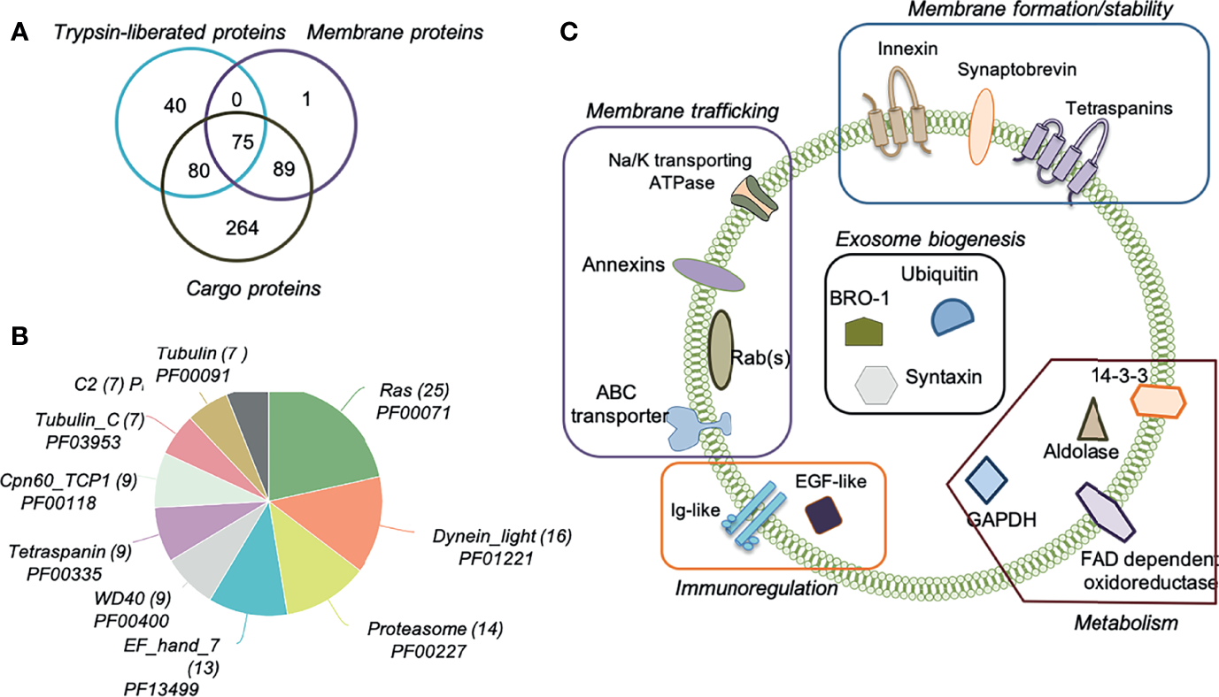 Highly pure O. viverrini 120k EVs obtained after iodixanol gradient were subjected to a proteomic analysis. To maximise the number of identifications and localise the proteins within the different fractions of the EVs, we “shaved” exposed vesicle surface proteins using a mild trypsin digestion and, subsequently, cargo and membrane proteins were characterised. We confidently identify 549 unique proteins with 2 or more unique peptides, including 195 as trypsin-liberated (or “shaved”) proteins (Supplementary Table S3), 165 as membrane proteins (Supplementary Table S4) and 505 as cargo proteins (Figure 2A and Supplementary Table S5). A Pfam analysis of the families and domains present in these 549 proteins revealed that the Ras family (PF00071) was most highly represented, with 25 proteins belonging to this family, followed by Dynein light chain (PF01221, 16 proteins) and Proteasome (PF00227, 14 proteins) (Figure 2B). Not surprisingly, 9 proteins belonged to the Tetraspanin family (PF00335), including Uroplakin (OON13593.1, OON14078.1 and OON19878.1), CD63 (OON14177.1, OON14450.1, OON15235.1, OON16191.1 and OON16870.1) and CD9/81 (OON15358.1) groups. Two of these sequences (OON16870.1 and OON14450.1) belong to the CD63 family of tetraspanins and had already been identified by our group (Chaiyadet et al., 2017) (Supplementary Table S6). Several proteins involved in exosome biogenesis (such as BRO-1, ubiquitin and syntaxin), as well as in immunoregulation (Ig-like and EGF-like proteins), metabolism (GAPDH, 14-3-3, aldolase, FAD dependent oxidoreductase among others) and membrane trafficking (annexins, ABC transporter and Na/K transporting ATPase among others) were also identified (Figure 2C). In addition to tetraspanins, other molecules involved in membrane formation and stability were identified (i.e. innexin and synaptobrevin).