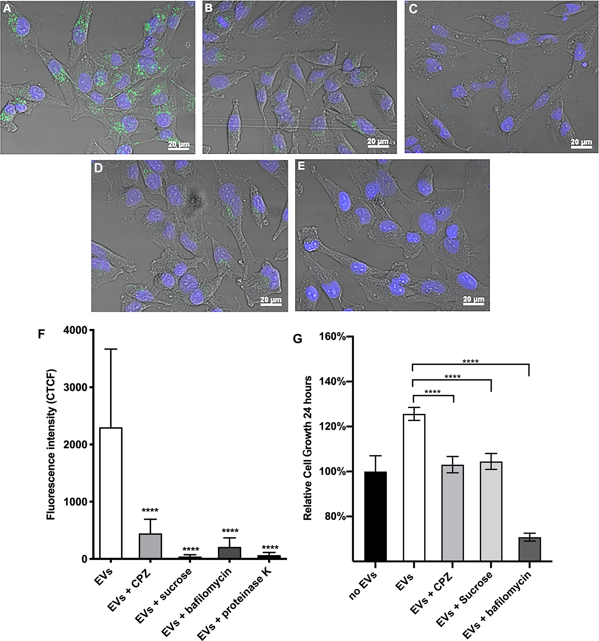 Chemical inhibition of endocytosis pathways blocks the uptake of O. viverrini 120k extracellular vesicles and reduces proliferation of cholangiocytes. H69 human cholangiocytes were cultured with PKH67-labeled O. viverrini 120k extracellular vesicles (EVs) for 2 hours in the presence of PBS control (A), chlorpromazine (CPZ) (B), sucrose (C) or bafilomycin A1 (D). PKH67-labeled 120k EVs were also pre-treated with proteinase K prior to co-culture with H69 cholangiocytes (E). Corrected total cell fluorescence was quantified by imageJ (F). Cholangiocyte proliferation induced by 120k EVs in the presence or absence of endocytosis inhibitors was measured in real time using an xCELLigence system (G). Thirty cells were counted form 3 random microscope fields for each sample in 2 independent experiments. Values are mean ± SD. The corresponding p-values (****P < 0.0001) were performed by one-way ANOVA with Tukey-Kramer post-hoc multiple comparison test.