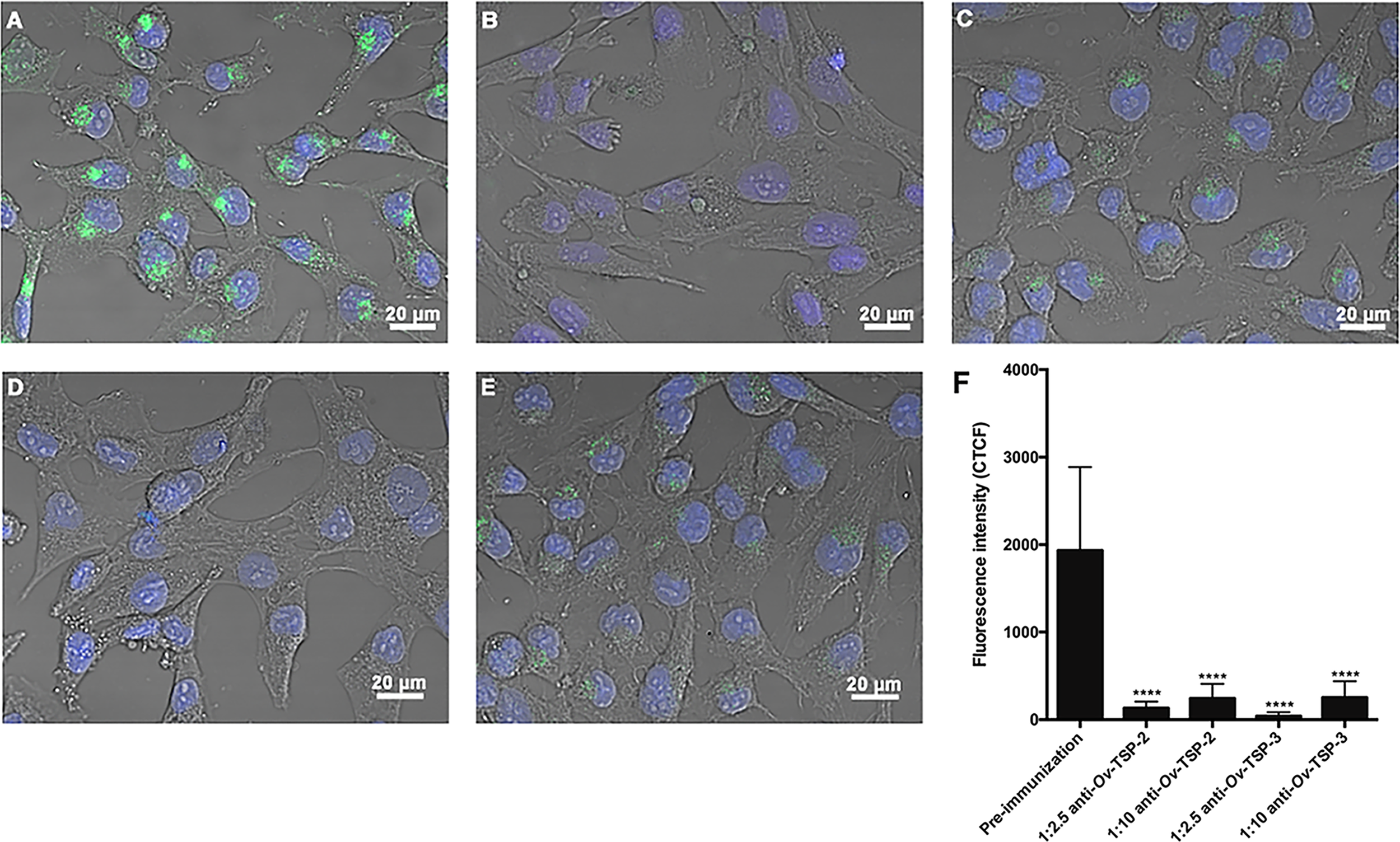 Antisera against recombinant Ov-TSP-2 and Ov-TSP-3 blocked the uptake of O. viverrini 120k extracellular vesicles by cholangiocytes. H69 human cholangiocytes were cultured with PKH67-labeled O. viverrini 120k extracellular vesicles (EVs) in the presence of rabbit pre-immunization serum (A), rabbit antiserum to recombinant Ov-TSP-2 at dilutions of 1:2.5 and 1:10 (B, C), rabbit antiserum to recombinant Ov-TSP-3 at dilutions of 1:2.5 and 1:10 (D, E). Corrected total cell fluorescence was measured at 490 nm (green channel) using ImageJ (F). The nuclei were stained by Hoechst (blue color). Thirty cells were counted form 3 random microscope fields for each sample in 2 independent experiments. Values are mean ± SD. The corresponding p-values (****P < 0.0001) were obtained by one-way ANOVA with Tukey-Kramer post-hoc multiple comparison test.