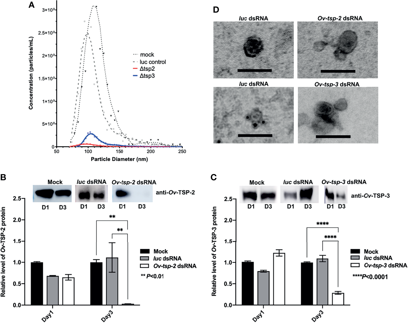 To determine whether silencing of the Ov-tsp-2 and tsp-3 genes affected EV secretion, we collected 120k EVs from culture supernatant after three days and quantified them by TRPS. Silencing of either tsp gene did not substantially impact on the mean diameter of the secreted vesicles (104-116 nm) but did result in a substantial reduction in the number of vesicles secreted by tsp-2 (4.17×108/ml) and tsp-3 (25.2×108/ml) dsRNA-treated flukes compared to both luc (2×1010/ml) and mock (2.29×1010/ml) controls (Figure 5A). To confirm the presence or absence of the respective TSPs in 120k EVs from dsRNA-treated worms, 2 µg of EV total protein (8×107 vesicles) per lane was electrophoresed by SDS-PAGE and transferred to nitrocellulose membrane then probed with anti-Ov-TSP-2 and Ov-TSP-3 rabbit sera and detected by chemiluminescence. Silencing of Ov-tsp-2 expression over a 3 day period resulted in 97% reduction (** P< 0.01) in TSP-2 protein levels in EVs when compared to mock control and luc dsRNA-treated EVs (Figure 5B), and absence of the TSP-2 protein by immunogold TEM (Figure 5D). Silencing of Ov-tsp-3 expression resulted in 72% reduction (**** P<0.0001) in TSP-3 protein levels in EVs when compared when compared to mock control and luc dsRNA-treated EVs (Figure 5C), and absence of the TSP-3 protein by immunogold TEM (Figure 5D). Both proteins were readily detectable in luc dsRNA-treated flukes using both western blot (Figures 5B, C) and immunogold TEM (Figure 5D).