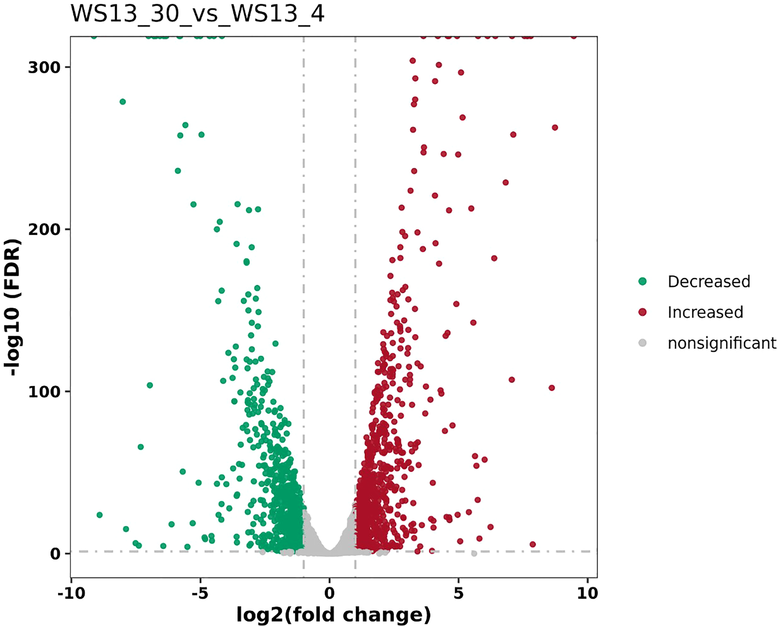 The volcano plots of DEGs between biofilms formed by S. putrefaciens WS13 under 4°C and 30°C.