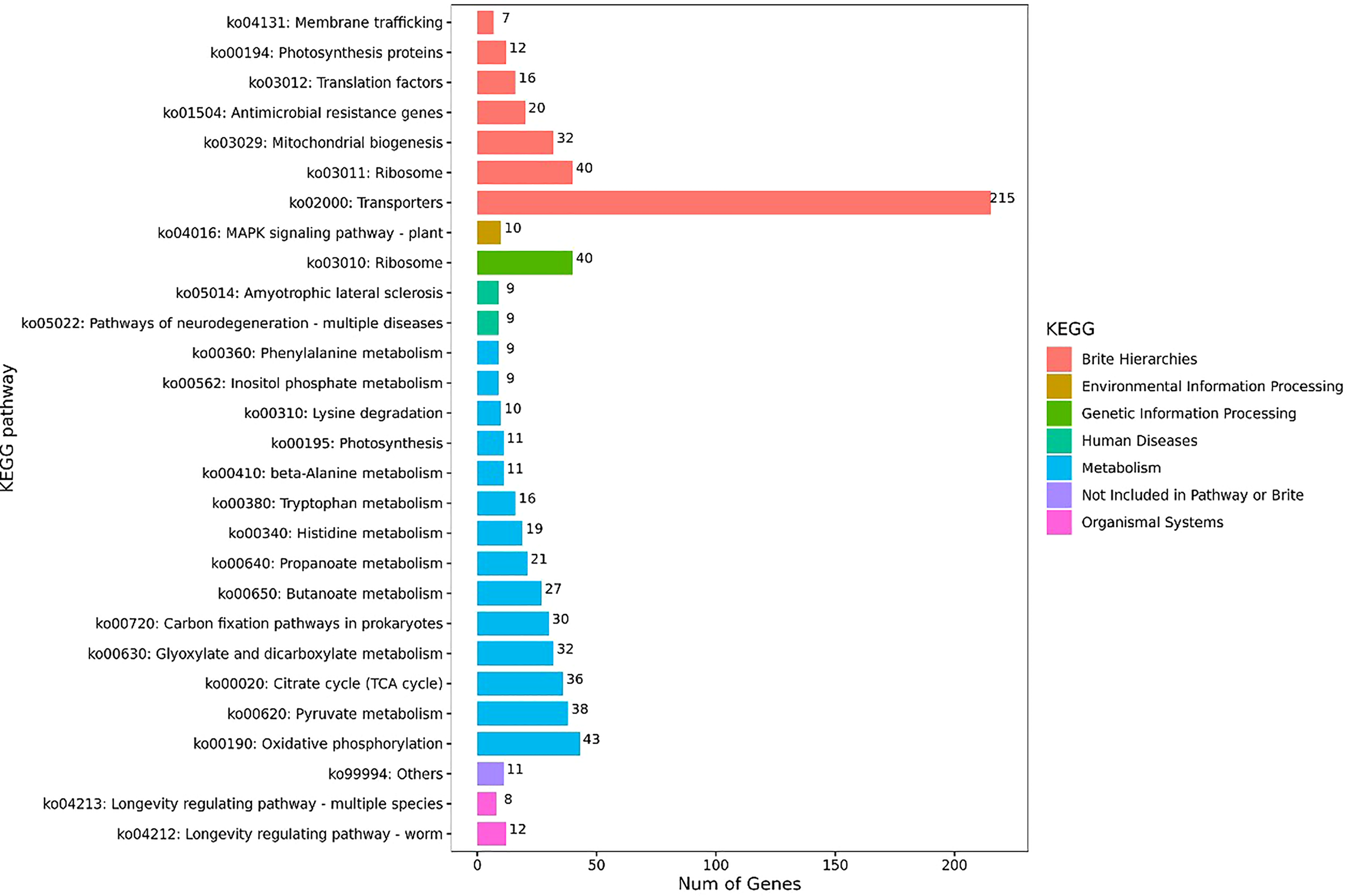 The KEGG pathway enrichment analysis was further performed on the identified DEGs in the obtained transcriptomes of S. putrefaciens biofilm cells, and the results revealed 28 significantly changed metabolic pathways, including ribosome, oxidative phosphorylation, citrate cycle, transporters, photosynthesis proteins, histidine metabolism, photosynthesis, tryptophan metabolism, pyruvate metabolism, glyoxylate and dicarboxylate metabolism, carbon fixation pathways in prokaryotes, lysine degradation, MAPK signaling pathway-plants, propanoate metabolism, butanoate metabolism, mitochondrial biogenesis, inositol phosphate metabolism, β-alanine metabolism, longevity regulating pathway-worm, amyotrophic lateral sclerosis, pathways of neurodegeneration-multiple diseases, translation factor, and others, antimicrobial resistance genes, membrane trafficking, phenylalanine metabolism, and longevity regulating pathway-multiple species (Figure 3).