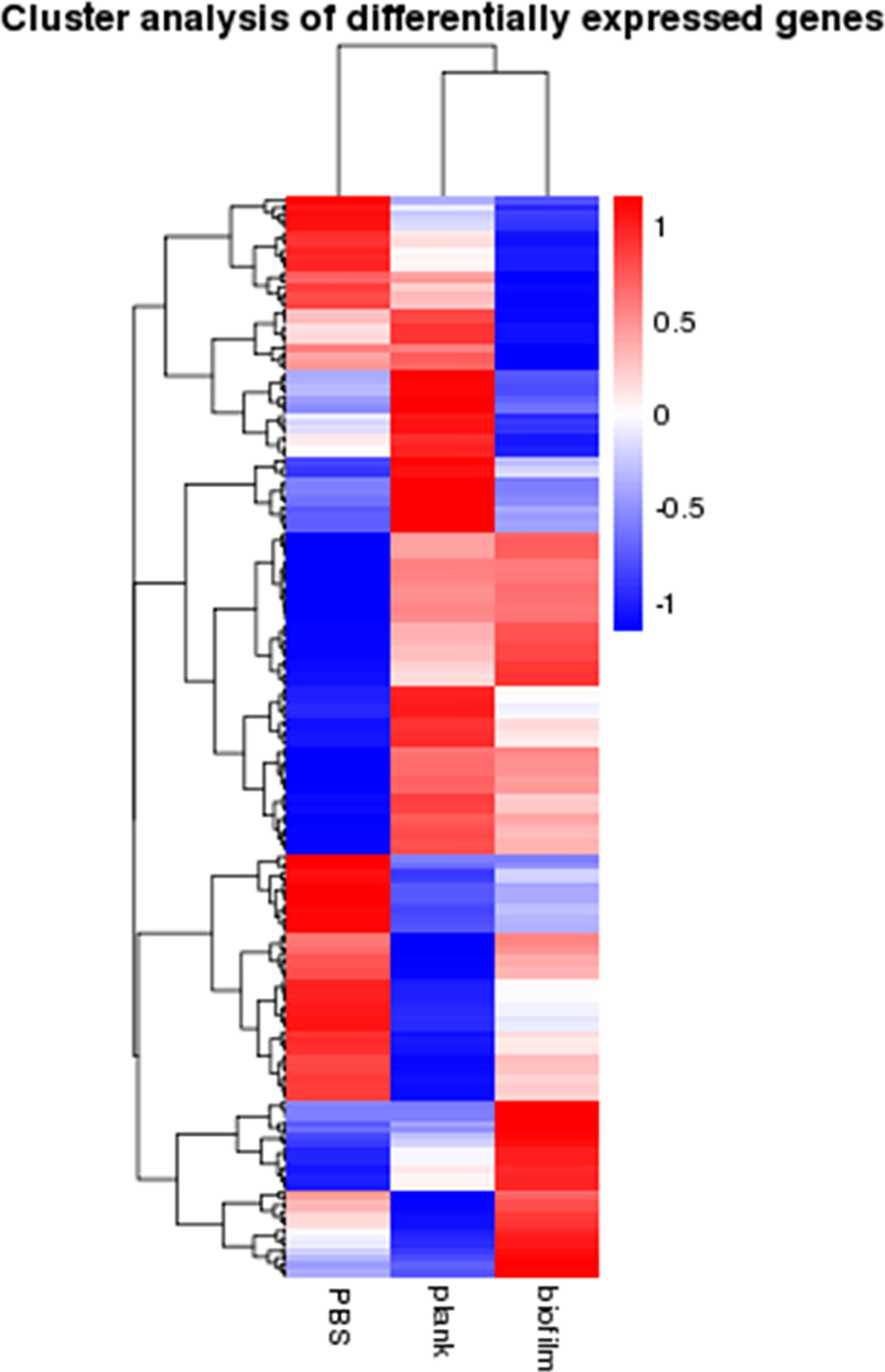 Signature genes with previously unknown functions can be identified via clustering analysis to find genes expression patterns. Figure 3 shows a heat map of mRNAs expressed as genes—the planktonic and biofilm groups yielded different trend from the PBS group.