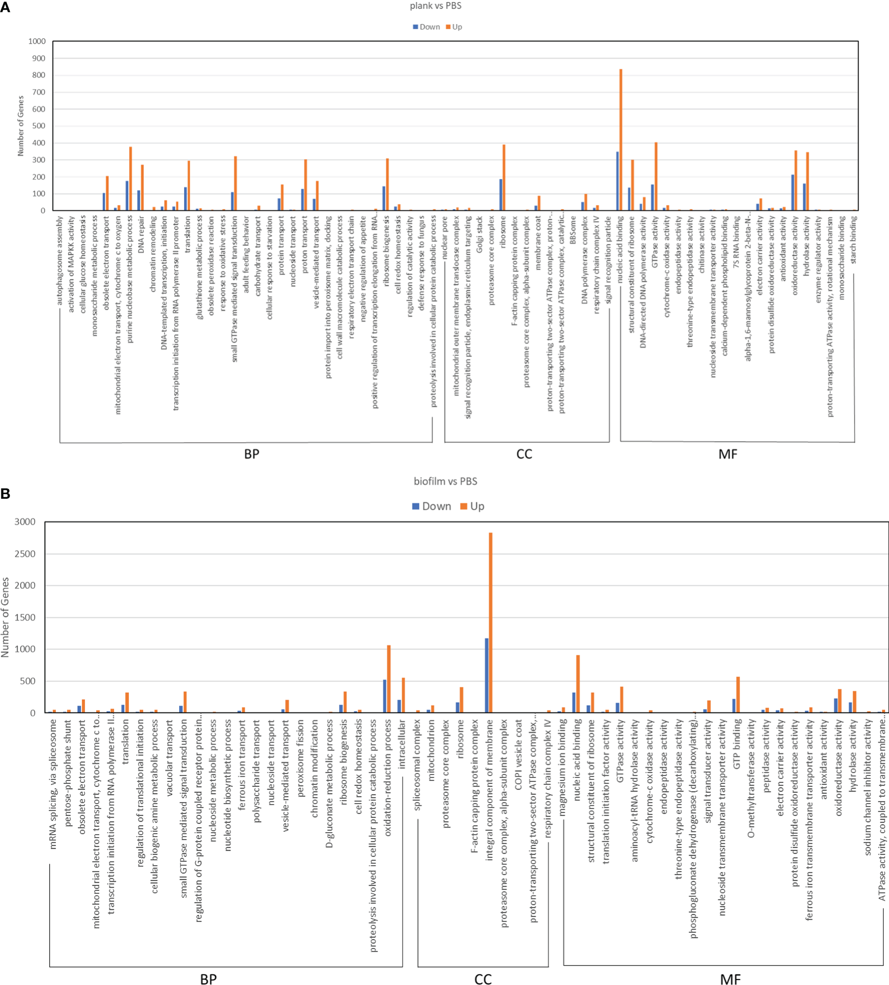 GO enrichment analysis of DEGs in Lactococcus garvieae planktonic- and biofilm-infected mullets. GO analysis was divided into three categories: biological process (BP), cellular component (CC), and molecular function (MF). (A) plank group; (B) biofilm group.