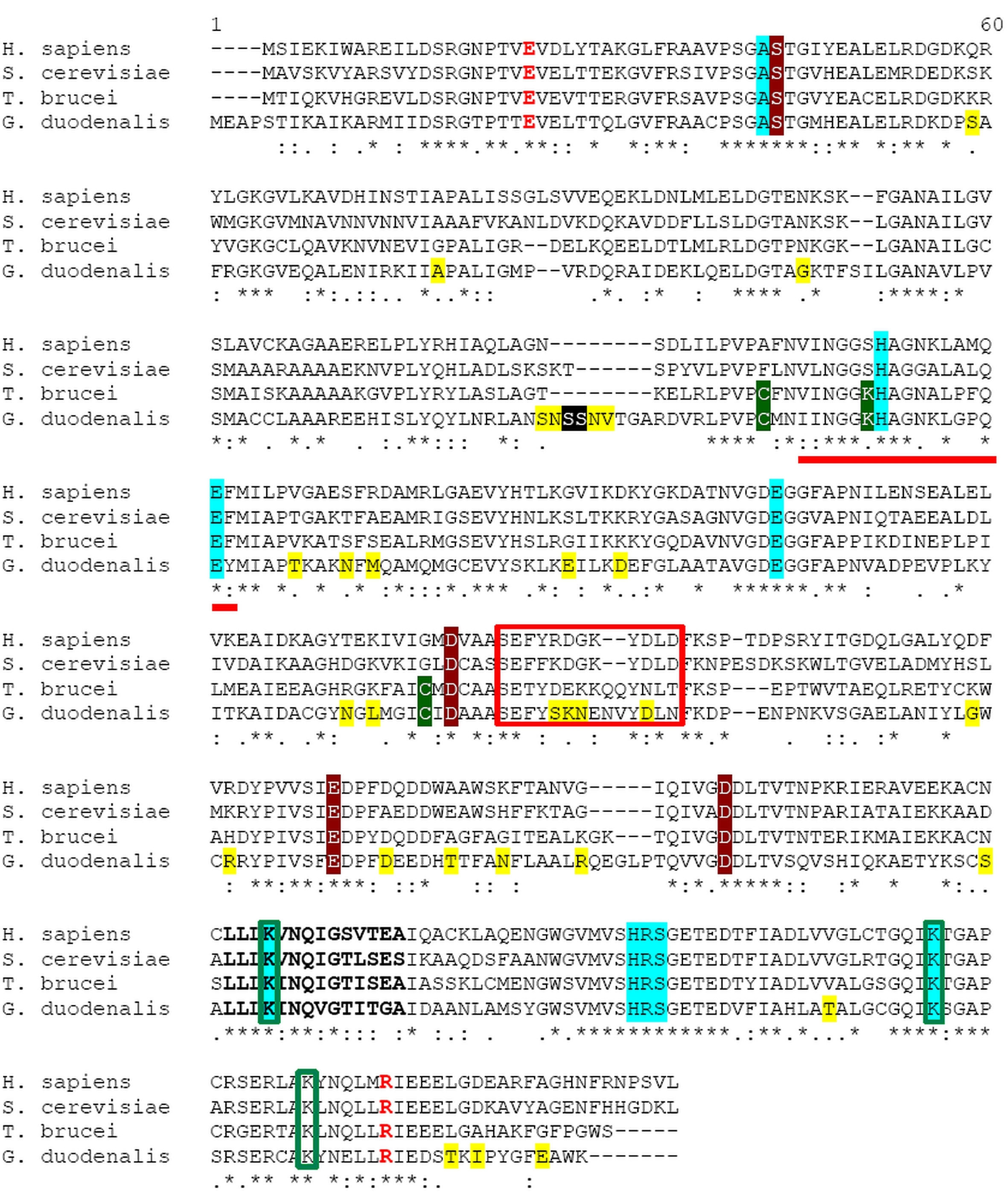 Supplementary Figure 1 | Alignment of the amino-acid sequences of Giardia enolase with similar proteins from different organisms. Amino-acid sequence alignment of enolases from Homo sapiens (a-enolase, accession number NP_001419), Saccharomyces cerevisiae (accession number AAA88713.1), Trypanosoma brucei (accession number XP_822542) and G. duodenalis assemblage A (GL50803_11118). Cyano-shaded letters indicate residues involved in ligand (phosphoenolpyruvate) binding and residues involved in Mg2+ binding are shown in brown-shaded letters. Green-shaded letters are unique reactive active-site residues found in enolases from some protozoa (Avilán et al., 2011) including Giardia. The three lysines considered as primary plasminogen binding sites are enclosed in green box whilst the red box indicates the proposed plasminogen binding motif. The underline in red identifies a conserved loop involved in the protonation of 2-phosphaglycerate by H159. The enolase signature is indicated in bold letters. Residues in red are that forming ionic bound in the enolase dimer. Yellow-shaded letters are variant residues between Giardia A, B and E assemblages and black-shaded letters are residues absent in assemblage E. Multiple sequence alignment was carried out using the CLUSTALW 2.1 software (http://www.genome.jp/tools/clustalw/) with default parameters