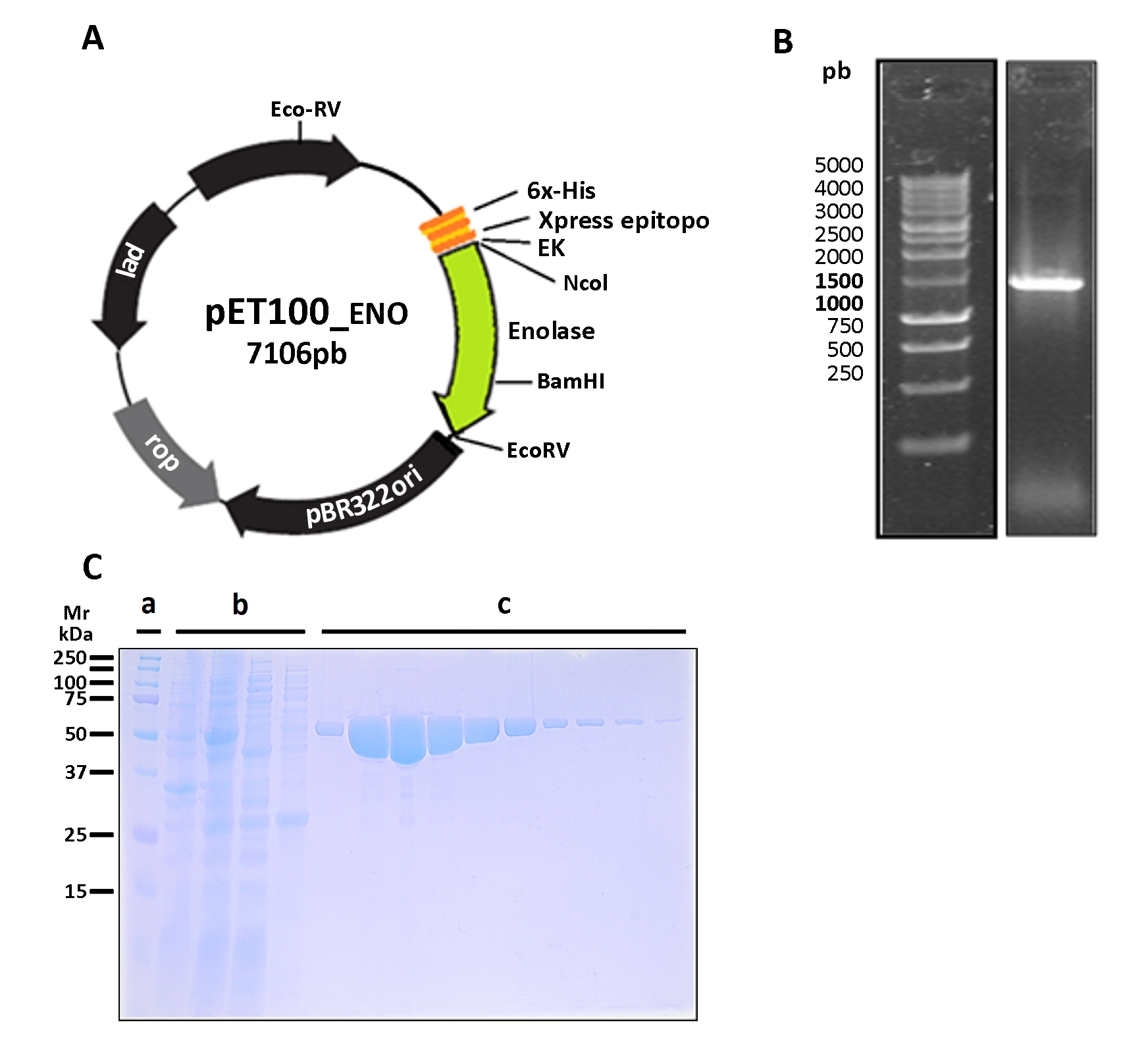 Supplementary Figure 2 | Enolase gene amplification, cloning and production of recombinant enolase. (A) Plasmid map for PET-100_ENO with the enolase gene in the PET-100 D-TOPO® (Invitrogen) transition-expression vector and 6XHis Tag. (B) PCR amplification of a 1500 bp product resolved in a 1% agarose gel and stained with ethidium bromide which was, confirmed to be the enolase gene by automatic DNA sequencing. (C) SDS-PAGE of the fractions obtained during the purification process of rGd-eno; demonstrate an enriched band of ≈48 kDa corresponding to enolase obtained in the faction C.