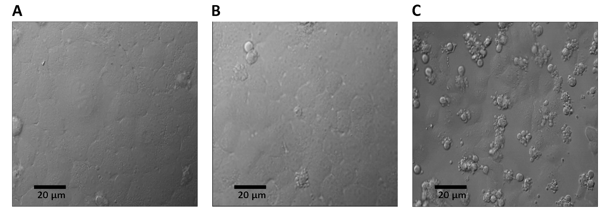 Supplementary Figure 3 | Absence of damage in IEC-6 cells by extracts from E. coli BL21 Star lacking Gd-eno. IEC-6 monolayers were incubated for 2h at 370C in 2 cm2 wells in serum free DMEM medium (A) Control IEC-6 cell monolayers incubated with DMEM only, showing the normal morphology of the cell monolayer. (B) IEC-6 monolayers incubated with E. coli BL21 Star extracts dialyzed and passed through a High Capacity Endotoxin Removal (Pierce™) column. (C) IEC-6 cell monolayers exposed to rGd-eno.