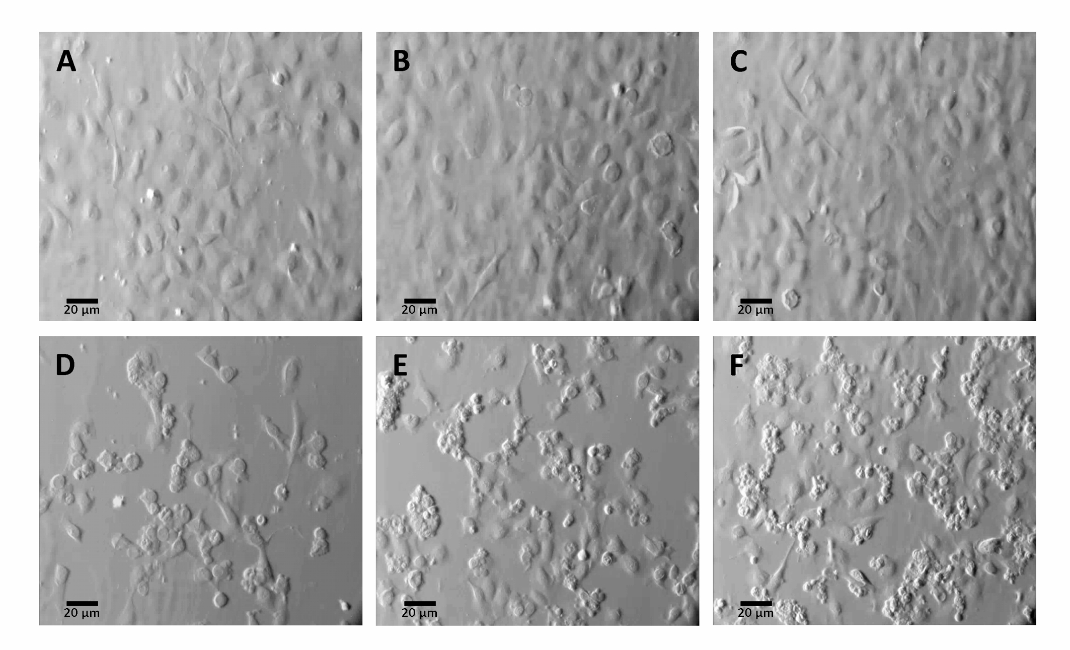 Supplementary Figure 4 | Determination of IEC-6 monolayer cell confluence on cell damage induced by rGd-eno. IEC-6 cell monolayers were incubated with rGdeno as described in material and methods. IEC-6 cell monolayers were grown at three different confluences (D) 50%, (E) 70% and (F) 100% in the presence of 100 mg/ml; of rGd-eno. (relative glycolytic activity 58 mmol/ minx mg of protein). Untreated IEC-6 cell monolayers grown at the same confluences of 50% (A), 70% (B) and 100% (C) were used as negative controls. Micrographsare representative of three independent experiments.