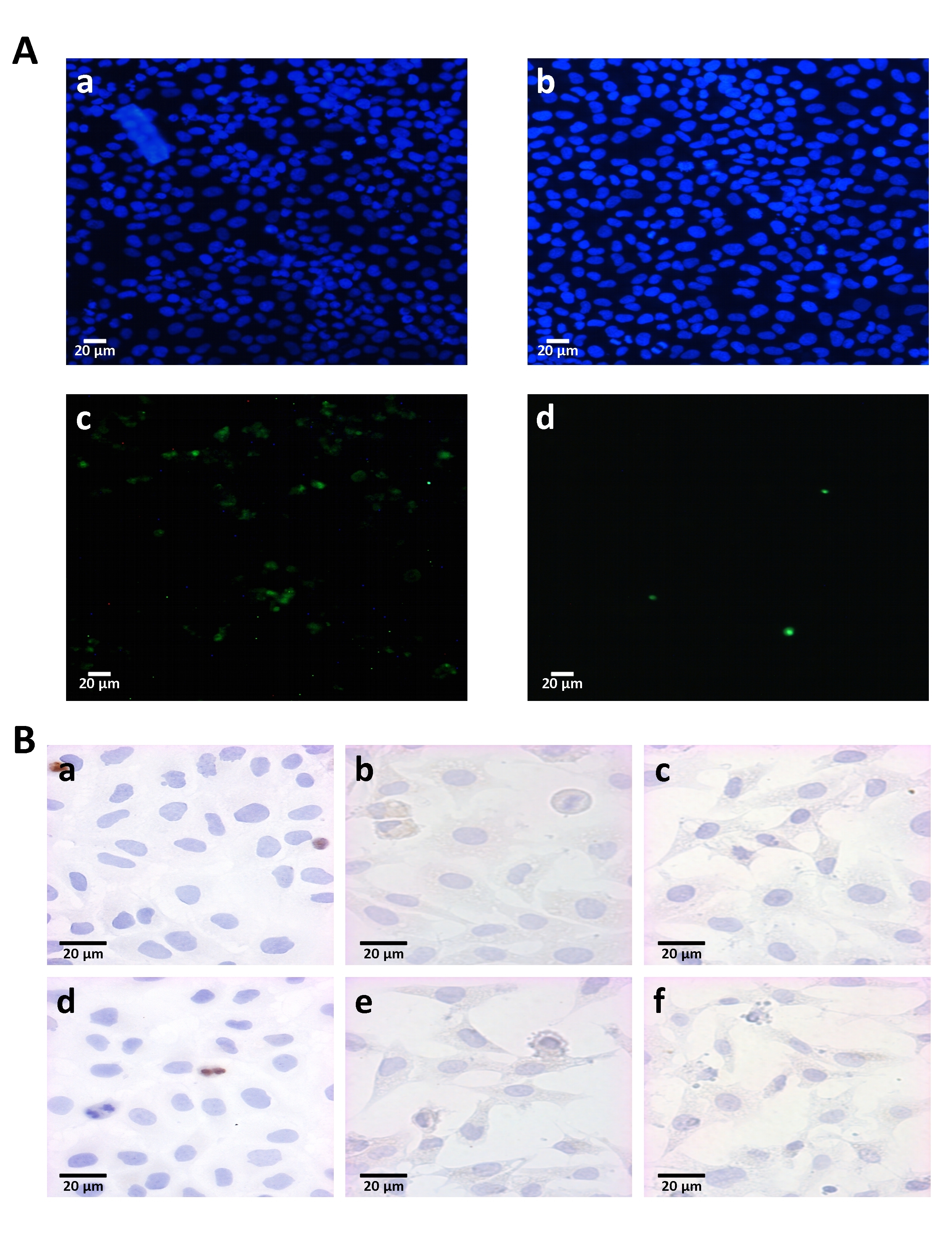 IEC-6 cells were grown on coverslips in DMEM at 37°C and 5% CO2 and when confluence was reached, the monolayers were exposed to purified rGd-eno at a final concentration of 100 μg/mL (reference glycolytic activity 58 μmol/min xmg of protein) for 2 h. Negative controls were IEC-6 cells incubated with DMEM alone and positive controls were IEC-6 cell monolayers exposed to 50 µM H2O2, cells without enolase were then incubated for 2h under the same conditions. After this, coverslips were treated with Annexin V-FITC conjugate (BioVision, Milpitas, Ca, USA) for 5 min following the manufacturer´s instructions, fixed with 2% PFA for 1 h, washed once with PBS and analyzed using an Axioscope Zeiss Zeiss epifluorescence microscope. For quantification by flow cytometry, cells were collected and exposed to the treatments mentioned above an analyzed with the Annexin V-FITC Apoptosis Kit (BioVision, Milpitas, Ca, USA) following the manufacturer’s instructions.