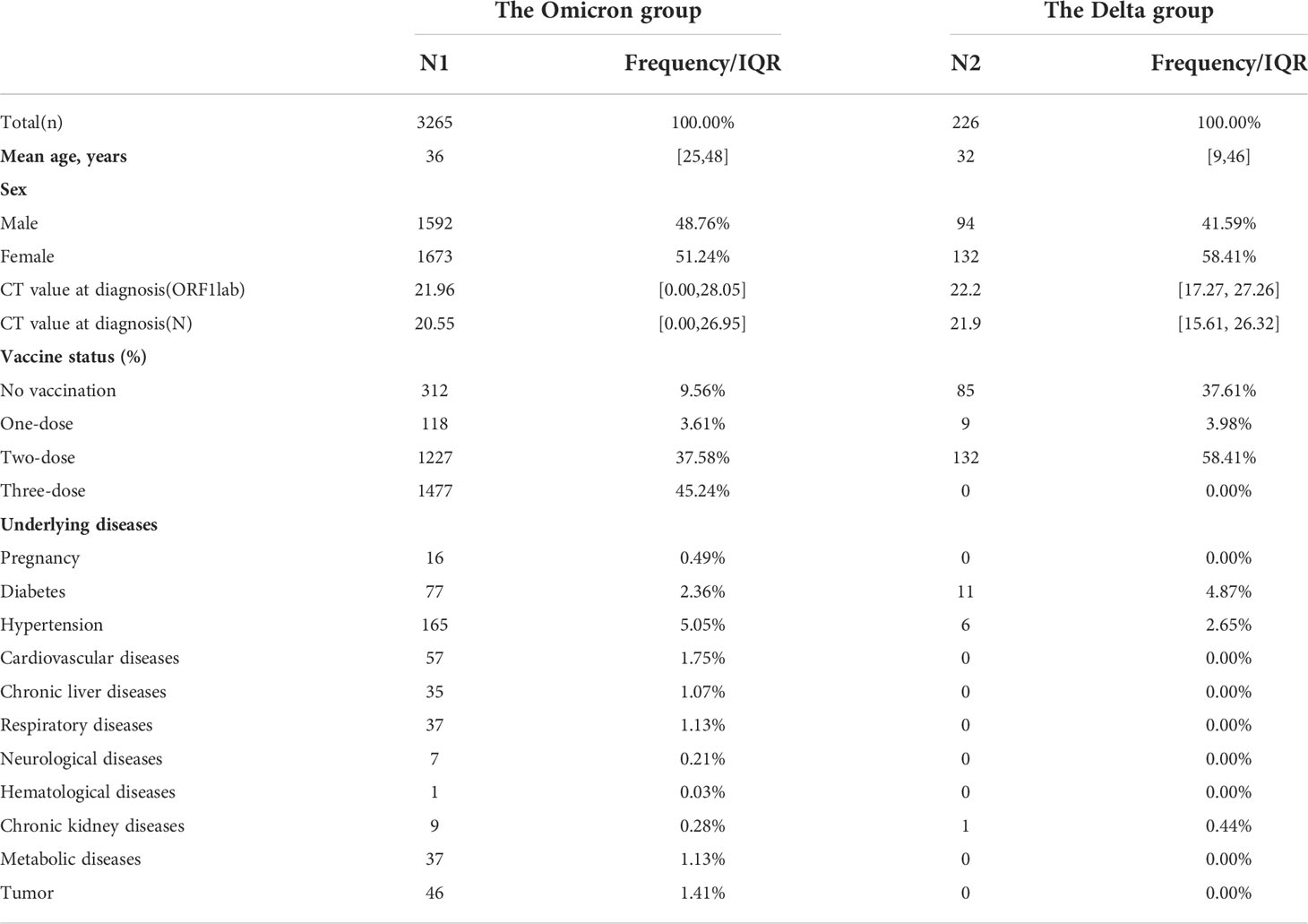 The demographic characteristics of the patients are shown in Table 1. The total number of infected persons in the Omicron group and the Delta group was 3,265 and 266, respectively. The median age of the Omicron-infected patients was higher than that of the Delta-infected patients [36 (25,48) vs. 32 (9,46)] (Li H. et al., 2022); the most common primary diseases in both groups were hypertension (5.61% vs. 2.65%) and diabetes (2.62% vs. 4.87%); 16 pregnant women were found in the Omicron group.