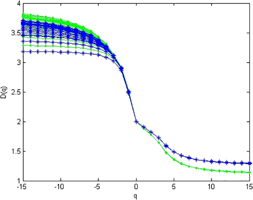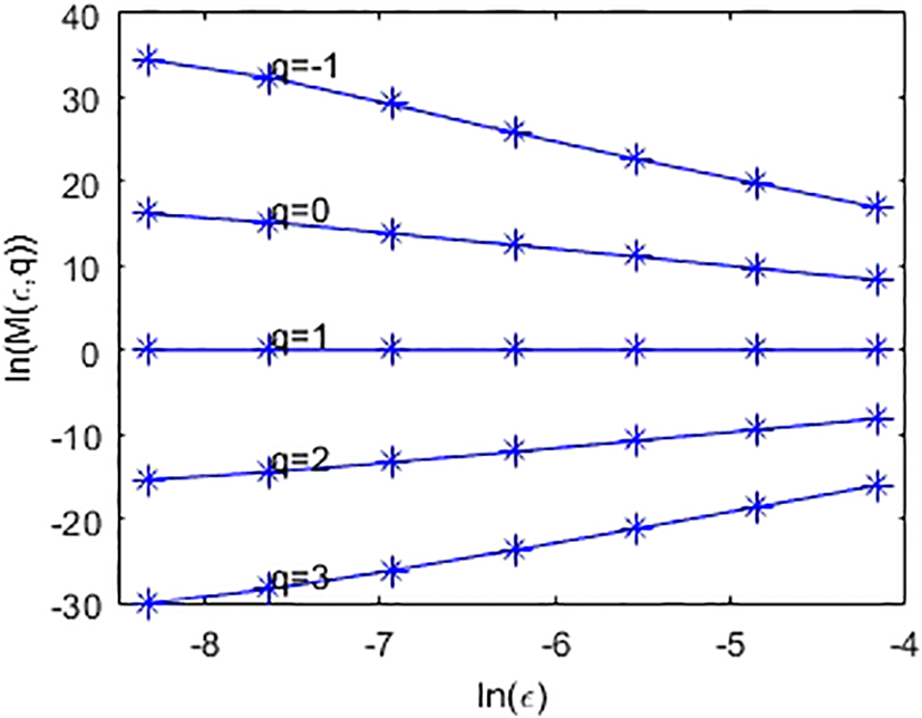 Then, D(q) can be calculated by linear fitting and ln(ϵ) (Vélez et al., 2010; Moreno et al., 2011).