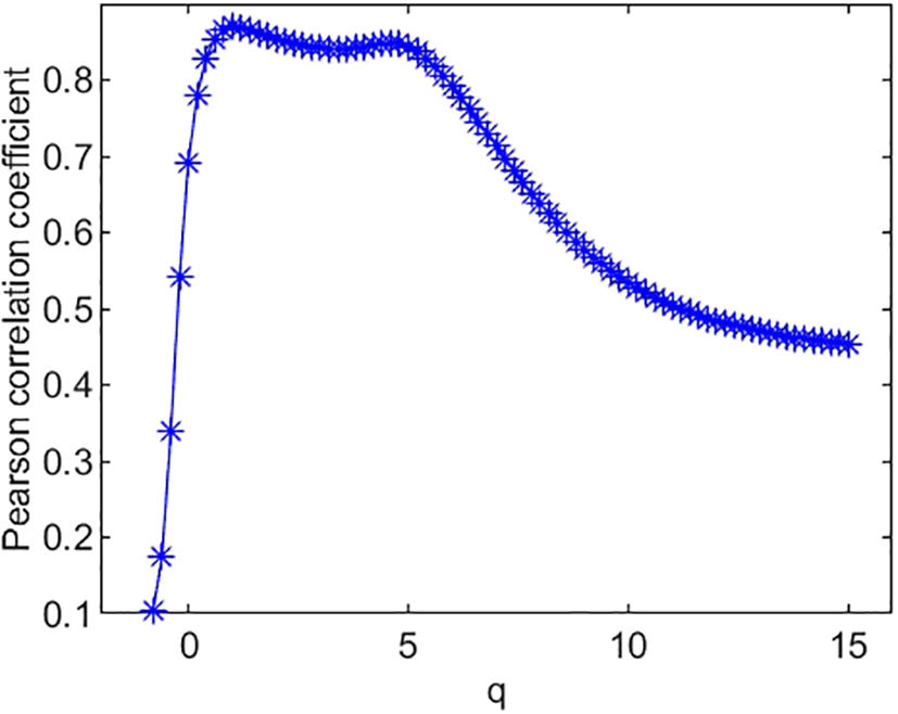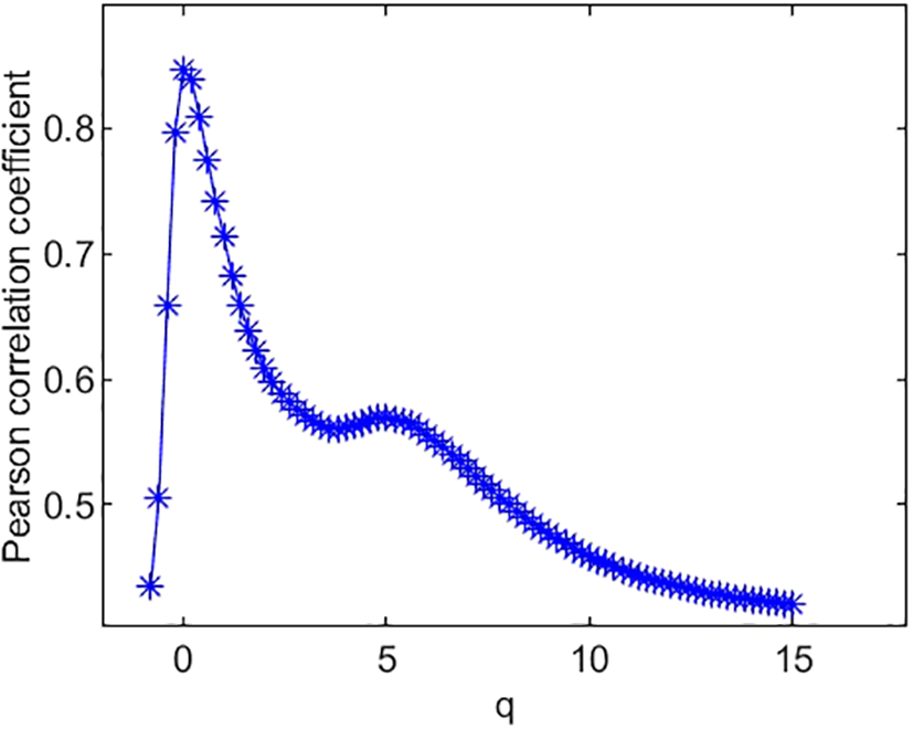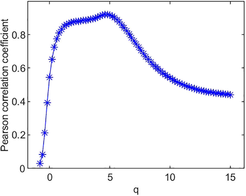Pearson correlation coefficient of species richness and multifractal dimension D(q).