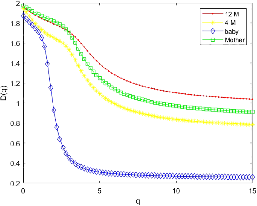 As an example, we plotted multifractal dimensions of a selected gut microbiome of a baby in Figure 7. The plot demonstrates the multifractal dimensions of gut microbiomes of an infant and his/her mother when he/she is a newborn (baby) and 4 months and 12 months old. Our method consumed 23 h 5 m 46 s for multi-fractal dimensions of the 400 metagenomes. Figure 9 suggests that the D(0) (fractal dimension),D(1) (information dimension), and D(2) (correlation dimension) are increasing with growth. In other words, their gut microbial diversity is developing with growth. In order to study the generality of this property, we calculated the mean value and standard deviation of 100 multifractal dimensions of infants at 12 months and 4 months, when they were a baby, and their mothers, respectively.