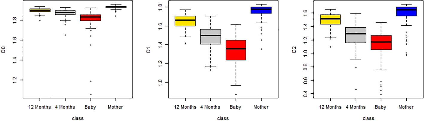 Boxplots of D(0), D(1), and D(2) of multifractal dimension of gut microbiomes of infants when they are 12 months old, 4 months old, and a baby, and that of the mother.