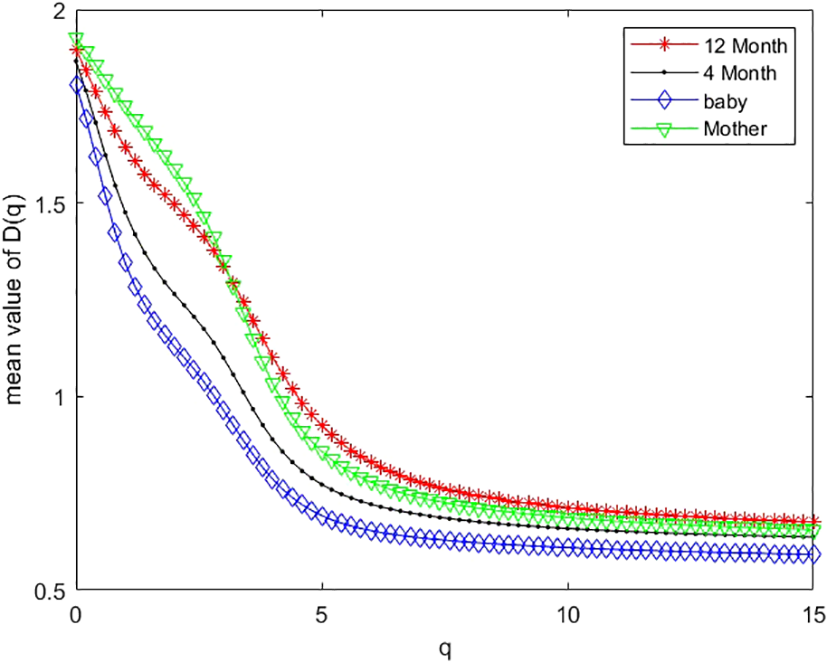 For dataset 3, there are 100 infants’ gut microbiomes. We grouped each infant gut micobiome as one group, and there are 100 groups of gut microbiomes. For each group, we calculated the difference between 12 months and 4 months, 12 months and newborn, and 4 months and newborn, respectively. In order to observe the overall characteristics of these multifractal dimensions, we plotted the mean value of 100 multifractal dimensions of gut microbiomes in Figure 9. From Figure 9, we can draw similar conclusions to the above.