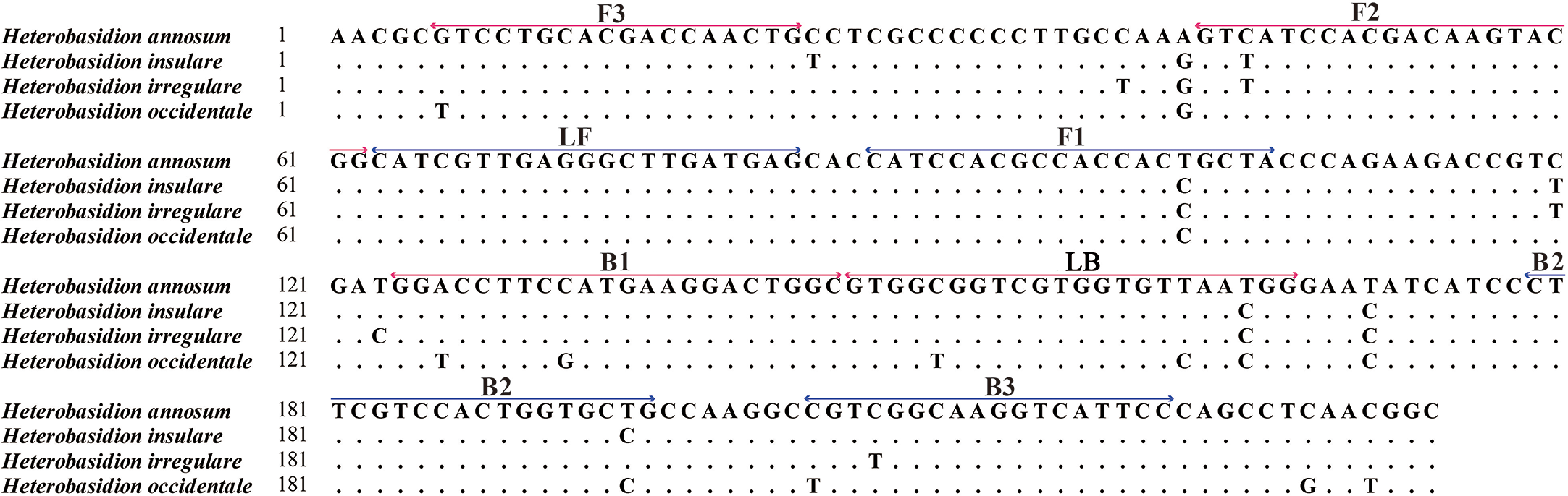 Genomic alignment between Heterobasidion annosum and H. insulare, H. irregulare, and H. occidentale at the locus selected for design of the LAMP primer sets. The locations of the designed primers (F3–B3) are shown: forward primer FIP includes the F1 and F2 regions; backward primer BIP includes the B1 and B2 regions; and loop primers include the LB and LF regions. (Red color represents the forward primers, and blue color represents the reverse primers).