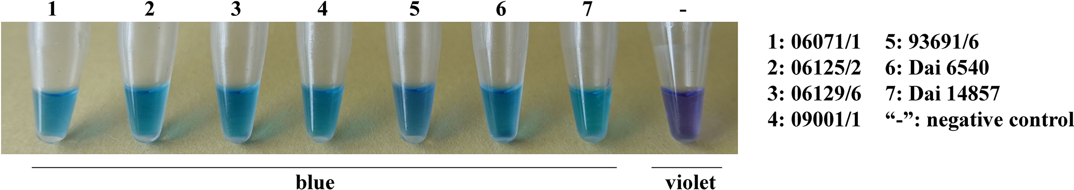 LAMP detection of the GAPDH gene in different isolates of Heterobasidion annosum. 1–7: H. annosum strains; “-”: negative control.