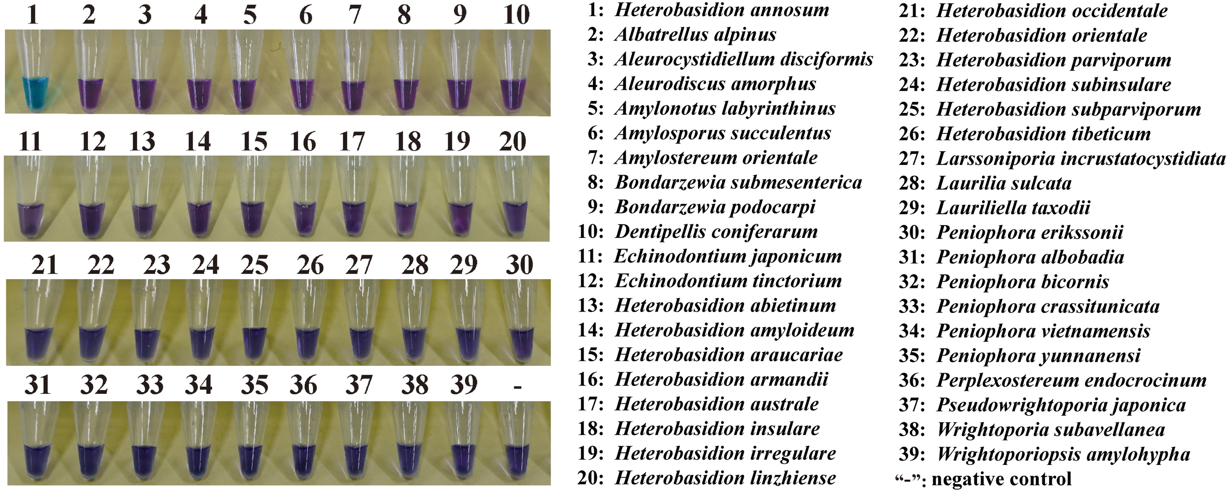 Ability of the LAMP assay to distinguish H. annosum from other species in Russulales. “-”: negative control.