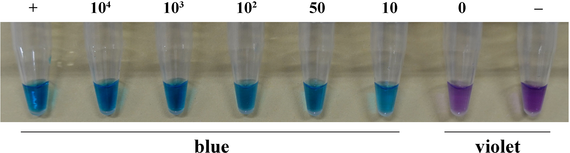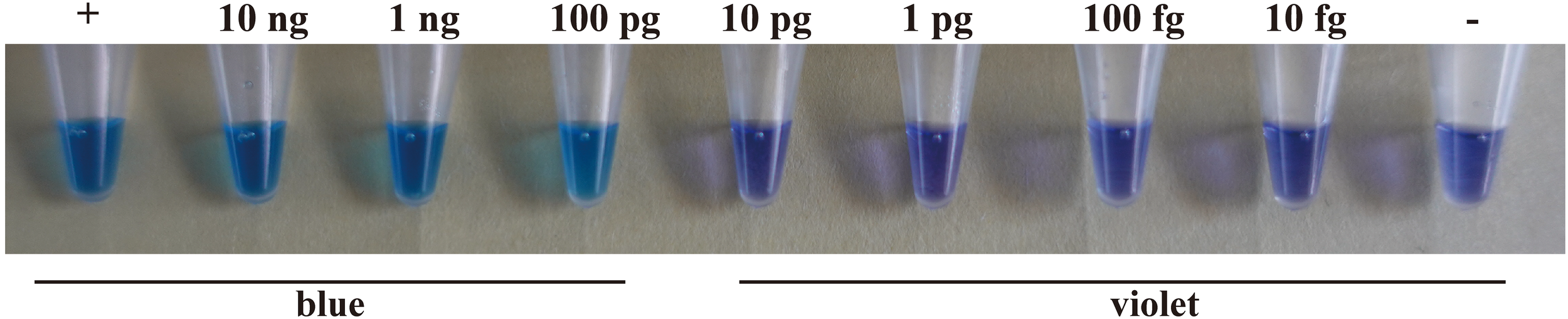 LAMP sensitivity was tested using 10-fold serial dilutions of target genomic DNA prepared with distilled water (10 ng·μL-1, 1 ng·μL-1, 100 pg·μL-1, 10 pg·μL-1, 1 pg·μL-1, 100 fg μL-1, 10 fg·μL-1). A Nanodrop spectrophotometer was used to measure DNA concentration. The results showed that a blue color could be detected up to the point where the DNA concentration was as low as 100 pg·μL-1. However, the color remained violet when the DNA concentration was reduced further to 10 pg·μL-1, 1 pg·μL-1, 100 fg μL-1, or 10 fg·μL-1 (Figure 4).