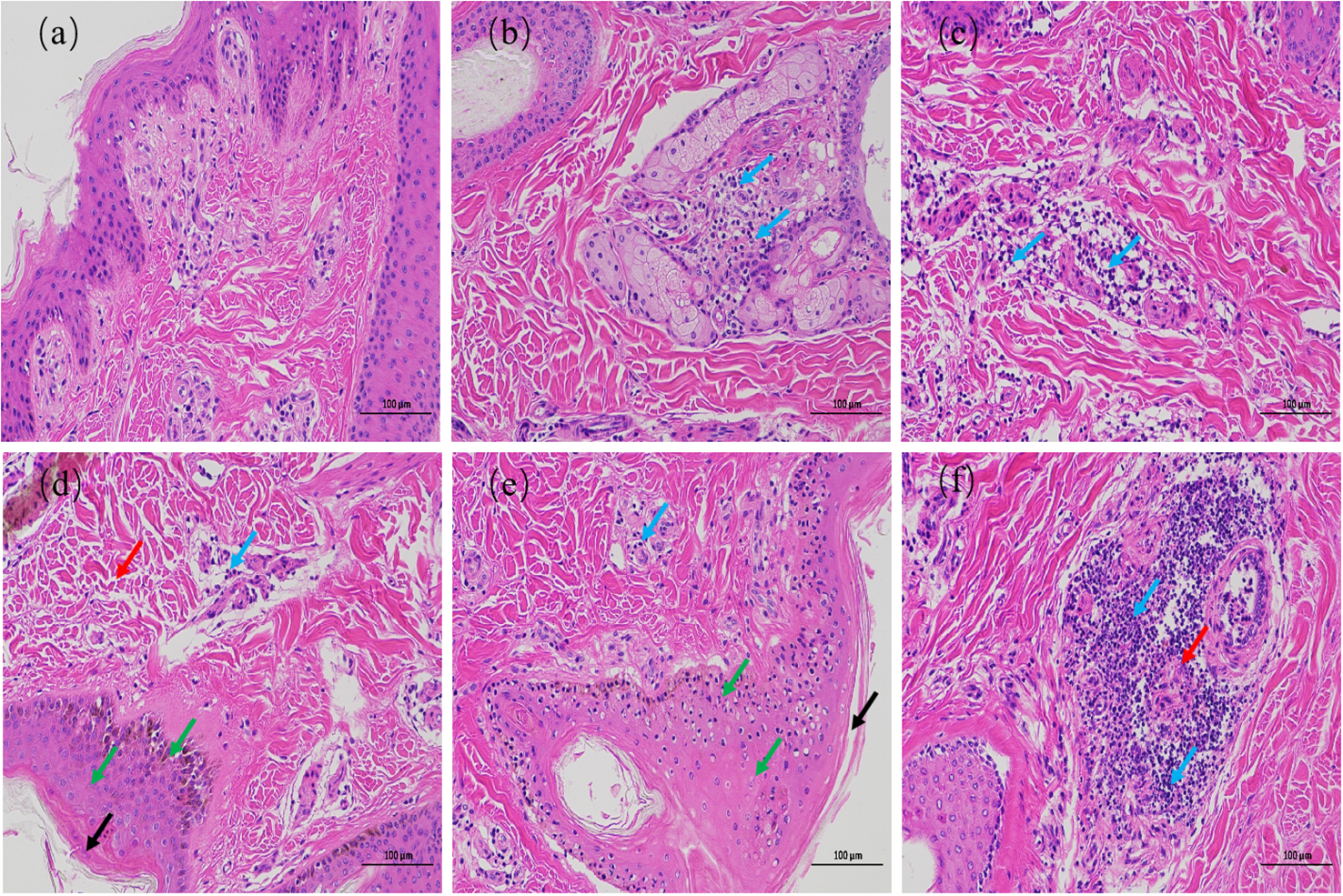 Hematoxylin and eosin staining images of intertoe skin explants infected with F. necrophorum over 72 h. (A) Skin explants infected with F. necrophorum at 0 h, (B) 12 h, (C) 24 h, (D) 36 h, (E) 48 h, and (F) 72 h. Blue arrows: lymphocyte infiltration in the dermis; Black arrows: hyperkeratosis of the epidermis; Red arrows: hair follicle, sweat gland, and sebaceous gland necrosis; Green arrows: cell degeneration, necrosis, and nuclear pyknosis. (Scale bar = 100 µm) .