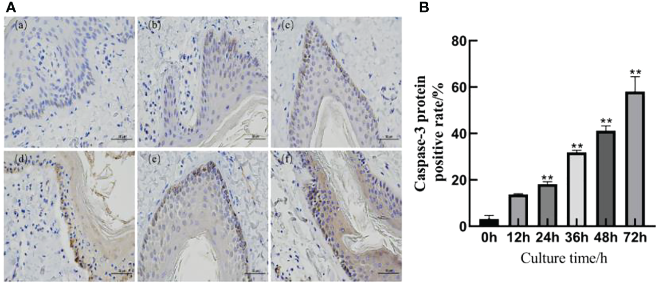 The immunohistochemical results are shown in Figure 4A. A slight positive expression of Caspase-3 protein was observed in the skin explants of the 0 h control group. Caspase-3 protein was significantly positively expressed in the epidermis and dermis of the skin explants at 12, 24, 36, 48, and 72 h after F. necrophorum infection. According to the distribution, the positive expression of Caspase-3 protein in the epidermis was higher than that in the dermis, and the positive expression rate was significantly different between the groups (P < 0.05). Compared with the control group, there was no significant difference in the positive expression rate of Caspase-3 protein in skin explants at 12 h after infection (Figure 4B, P > 0.05). The positive expression rate of Caspase-3 protein in skin explants at 24, 36, 48, and 72 h after infection was significantly different (Figure 4B, P < 0.05). Immunohistochemical results showed that the number of apoptotic cells in skin explants increased from 2.49% to 57.61% within 72 h of in vitro culture, which was consistent with the TUNEL staining results.