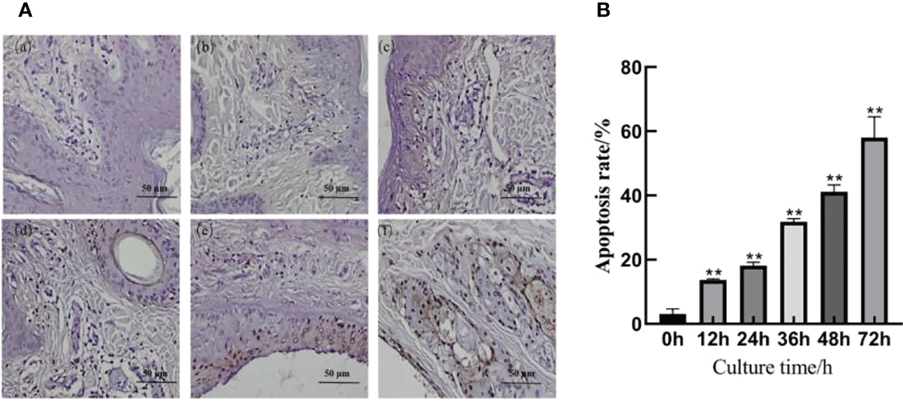 The TUNEL staining results are shown in Figure 3A; a small number of cells were apoptotic in the skin explants of the 0 h control group. At 12, 24, 36, 48, and 72 h after F. necrophorum infection, apoptotic cells were significantly expressed in the epidermis and dermis. According to their distribution, the number of apoptotic cells in the epidermis was higher than that in the dermis, and the apoptotic rate was significantly different between groups (Figure 3B, P < 0.01). Compared with the control group, the apoptosis rates of skin explants at 12, 24, 36, 48, and 72 h were significantly different (P < 0.01). The TUNEL staining showed that the number of apoptotic cells increased from 3.09% to 58.02% after 72 h in vitro culture, and the activity of apoptotic cells increased positively with in vitro culture duration.