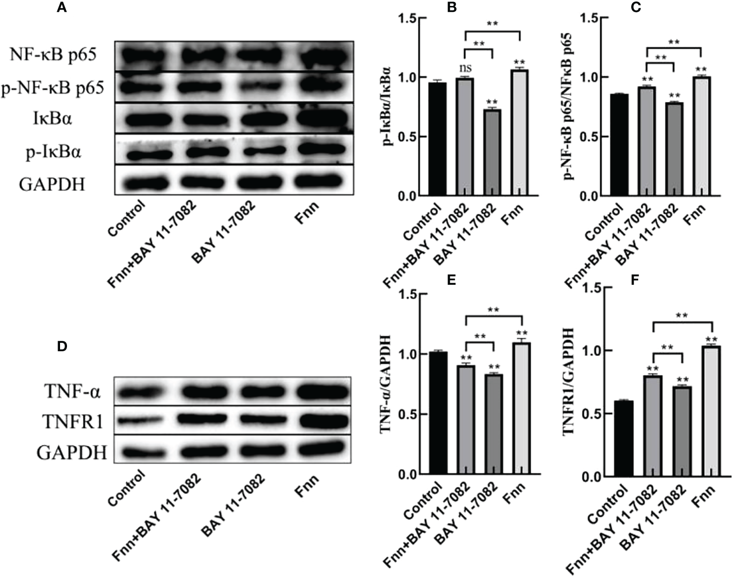 Activation of the nuclear factor-κB (NF-κB) signaling pathway in intertoe explants by F. necrophorum infection. Skin explants were treated with F. necrophorum a concentration of 1 × 108/mL and/or 50 mM BAY 11-7082 for 24 h. (A) Western blotting results of p-NF-κB p65, NF-κB p65, p-IκB α, and IκB α. (B) Phosphorylation levels of IκB α. (C) Phosphorylation levels of NF-κB p65. (D) Western blotting results of TNF-α and TNFR1. (E) Significant relationship of TNF-α expression. (F) Significant relationship of TNFR1 expression. The data presented are the mean ± SD. *statistical significance (P < 0.05). **statistical significance (P < 0.01). The symbols * and ** indicate the significant differences with the control group. ns, not significant.