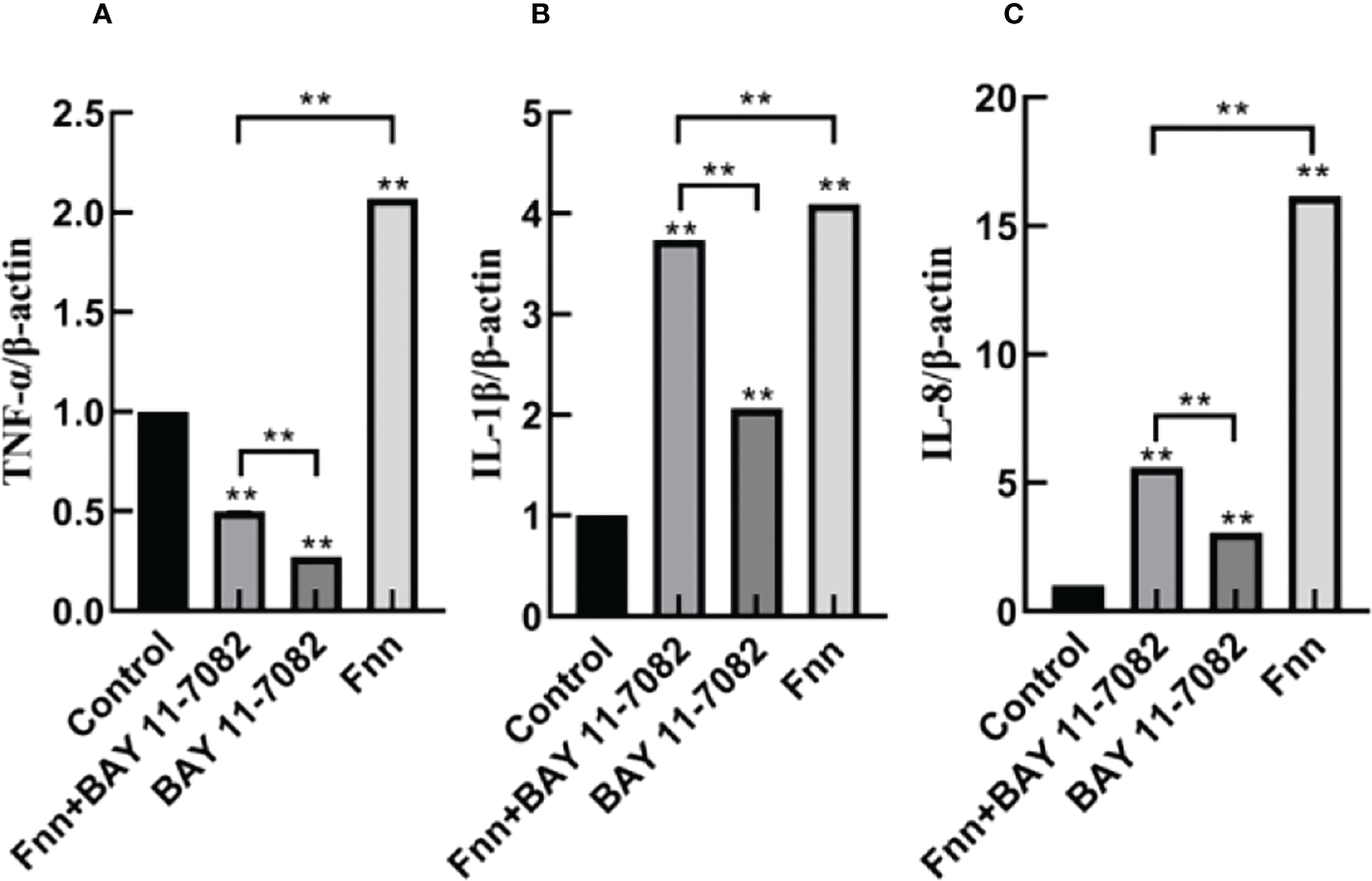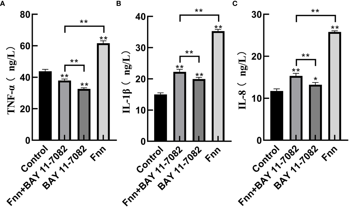 The mRNA expression and concentration of TNF-α in the F. necrophorum group were significantly higher than in the control group (Figures 6, 7A, P < 0.01), but the expression and concentration of TNF-α were significantly decreased by BAY 11-7082 treatment (Figures 6, 7A, P < 0.01). F. necrophorum infection significantly increased the expression of IL-1β and IL-8, even after treatment with BAY 11-7082; the expression and concentration of IL-1β and IL-8 in each group were significantly higher than in the control group (Figures 6, 7B, C, P < 0.01). These results suggest that infection with F. necrophorum activated the NF-κB inflammatory pathway, and induced the synthesis and expression of inflammatory cytokines in the intertoe skin explants.