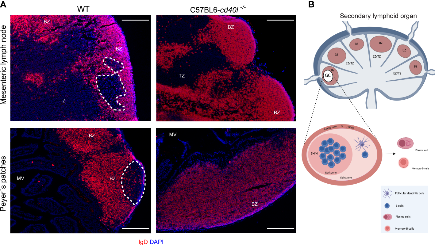 In situ distribution of IgD and germinal centre (GC) presence in MLN and PP in unimmunised WT and C57BL6-cd40l−/− mice. (A) Naïve B-cells (red) of MLN and PP in WT mice (left panel) and C57BL6-cd40l−/−mice (right panel). Cells were stained with DAPI (blue). GCs in MLN and PP are highlighted by the white dotted line, red areas indicate the B-cell zone (BZ), and the extrafollicular zone is stained in blue. GCs were observed in WT mice and were absent in C57BL6-cd40l−/−. White bars are equal to 200µm. BZ, B-cells zone; TZ, T-cells zone or EZ, extrafollicular zone and MV, microvilli. Representative images from six independent experiments. (B) Scheme of the structure of a secondary lymphoid organ: in red, the B-cell zone is also known as the follicle, in blue, the extrafollicular zone or T-cell zone, and within BZ in white, the GC. The GC magnification denotes the dark zone containing B-cells that undergo somatic hypermutation (SHM), and a light zone harbouring follicular dendritic cells that positively select B-cells. BZ, B-cells zone; TZ, T-cells zone or EZ, extrafollicular zone. Scheme B of Figure 1 was created using BioRender software (https://www.biorender.com/), agreement number BH25GW7T75.