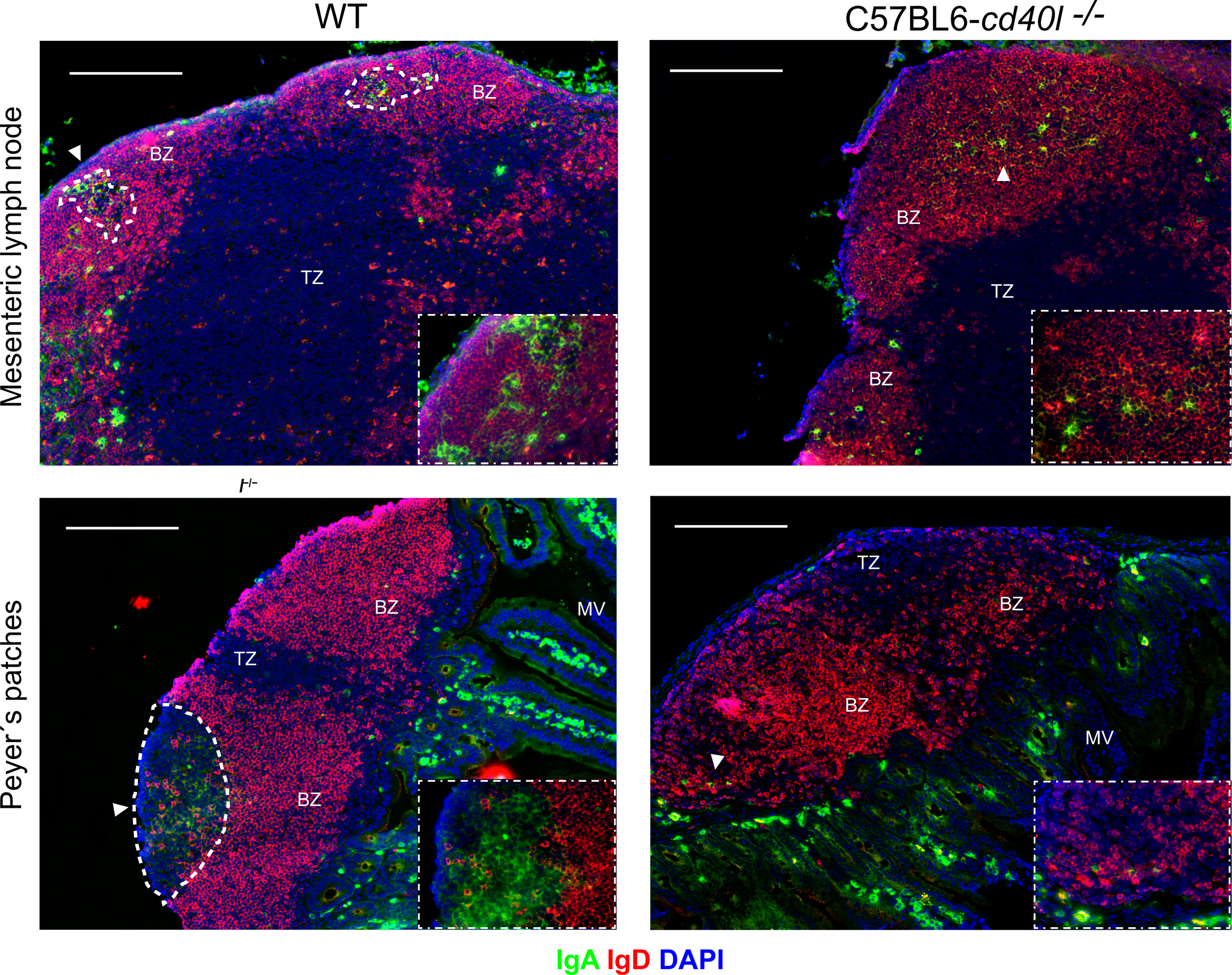 In situ distribution of IgD and IgA, among secondary lymph organs in unimmunised WT and C57BL6-cd40l−/− mice. MLN and PP of WT (left panels) and C57BL6-cd40l−/− (right panels) mice, were stained for IgD- (red), IgA-positive cells (green), and DAPI (blue), GCs were highlighted with a dotted white line. In WT mice in both MLN and PP (left panel), all IgA-positive cells were within the GC dotted white line as also shown in the lower right corner square magnification (40X), and all naïve B-cells (red) were outside the GC within the BZ. As shown in the right panel in C57BL6-cd40l−/−mice that lack GCs (right panel), IgA-positive cells (white arrows) and B naïve cells (red), were found within the BZ as shown in the lower right corner square magnification (40X). White bars are equal to 200µm. BZ, B-cell zone; TZ, T-cell zone. Representative images from six independent experiments.