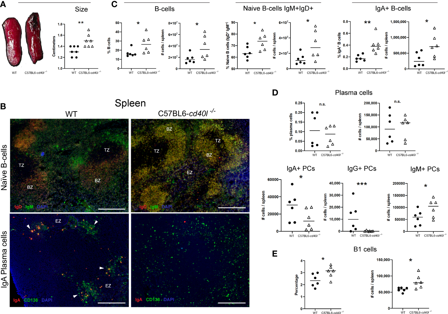 Secondary lymphoid organ size, microscopic localisation, and quantification of B-cells including plasma cells in unimmunised WT mice and C57BL6-cd40l−/− mice
