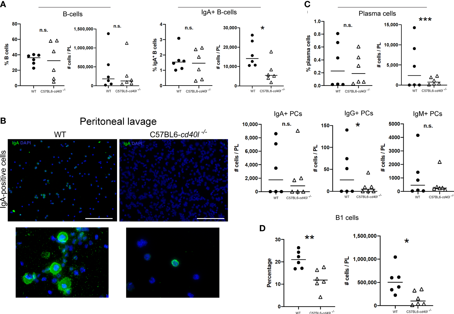 To compare and evaluate B-cell populations and IgA-producing plasma cells in peritoneal lavage, non-gut-associated SLOs, spleen/inguinal lymph nodes (ILN), and gut-associated SLOs, mesenteric lymph nodes (MLN)/Peyer´s patches (PP) of unimmunised C57BL6-cd40l−/− and C57BL6-wild-type (WT) mice.