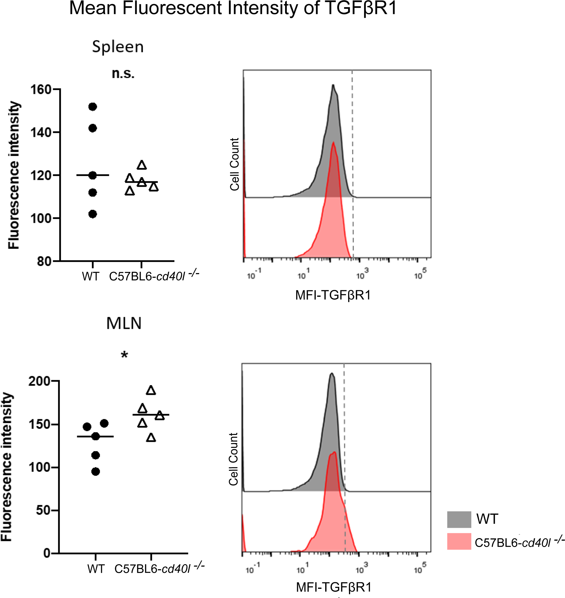 As illustrated in Figure 8, after flow cytometry analysis of the TGFβ receptor 1 (TGFβR1) on splenic B-cells, revealed that the receptor membrane expression was similar among both mouse strains; albeit the expression of TGFβR1 on the membrane of MLN B-cells of C57BL6-cd40l−/− mice was significantly higher (P=0.047) compared to MLN B-cells of WT mice.