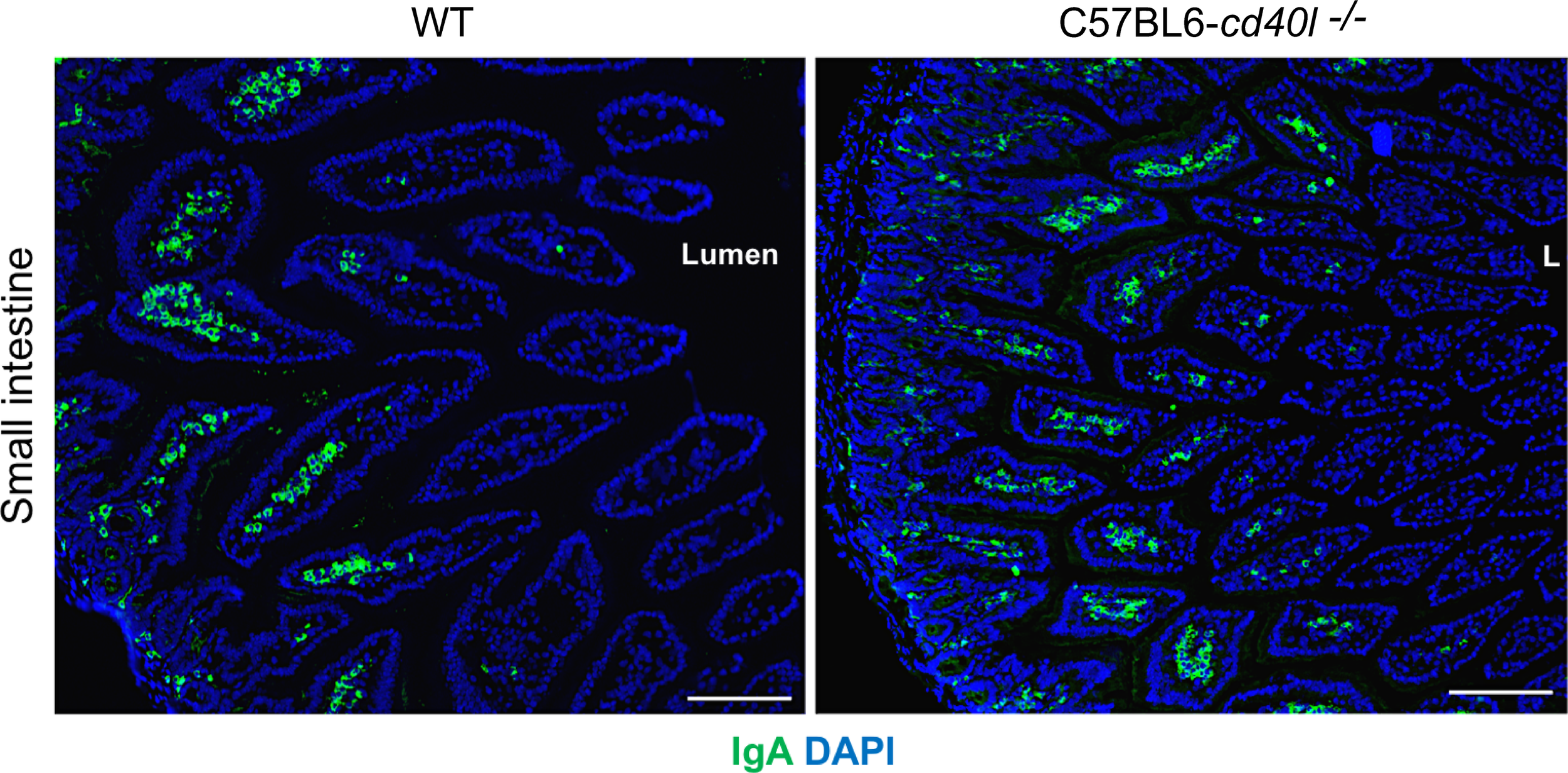 Evaluation of IgA-positive cells in the small intestine of unimmunised WT and C57BL6-cd40l−/− mice