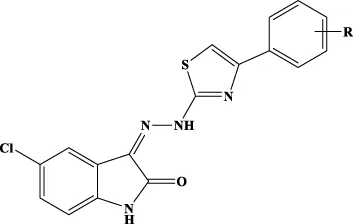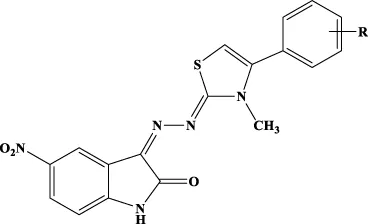 To a solution of hydrazine hydrate in ethanol, an equimolar amount of methyl isothiocyanate was added dropwise. The solution was stirred overnight at rt. A white precipitate was filtered and crystallized from ethanol to give N-methylhydrazinecarbothioamide (Mp. 135°C–137°C) in 89% yield. The obtained carbothioamide was then reacted with 5-nitroisatin in 2-propanol. The reaction was stirred under reflux overnight to give N-methyl-2-(5-nitro-2-oxoindolin-3-ylidene)hydrazine-1-carbothioamide. Yield: 96.57%; MS (ESI+): 280.05 ([M+H]+). The obtained oxoindolcarbothioamide was then reacted with the appropriate α-halogen aryl-ketone in refluxing 2-propanol to give the desired 3-[(3-methyl-4-arylthiazol-2-ylidene)hydrazineylidene]-5-nitroindolin-2-ones 1c–12c (Table 3).