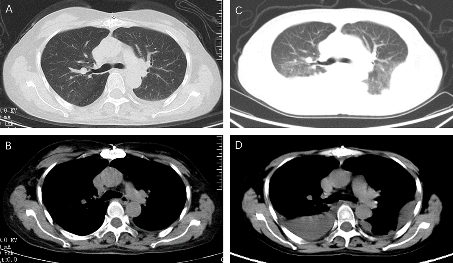 Chest computed tomography at different time points. In the patient with myasthenia gravis after thymoma surgery, a small left pleural effusion was noted on a transverse axial chest CT during regular follow-up (A, B). According to all examinations, the neurologist thought that the chest tightness was due to the recurrence of myasthenia gravis. Methylprednisolone (40mg per day) combined with gamma globulin (400mg per kg) was given. After three days of treatment, the patient's dyspnea worsened. A chest CT was taken again, showed a new bilateral pleural effusion (C, D).